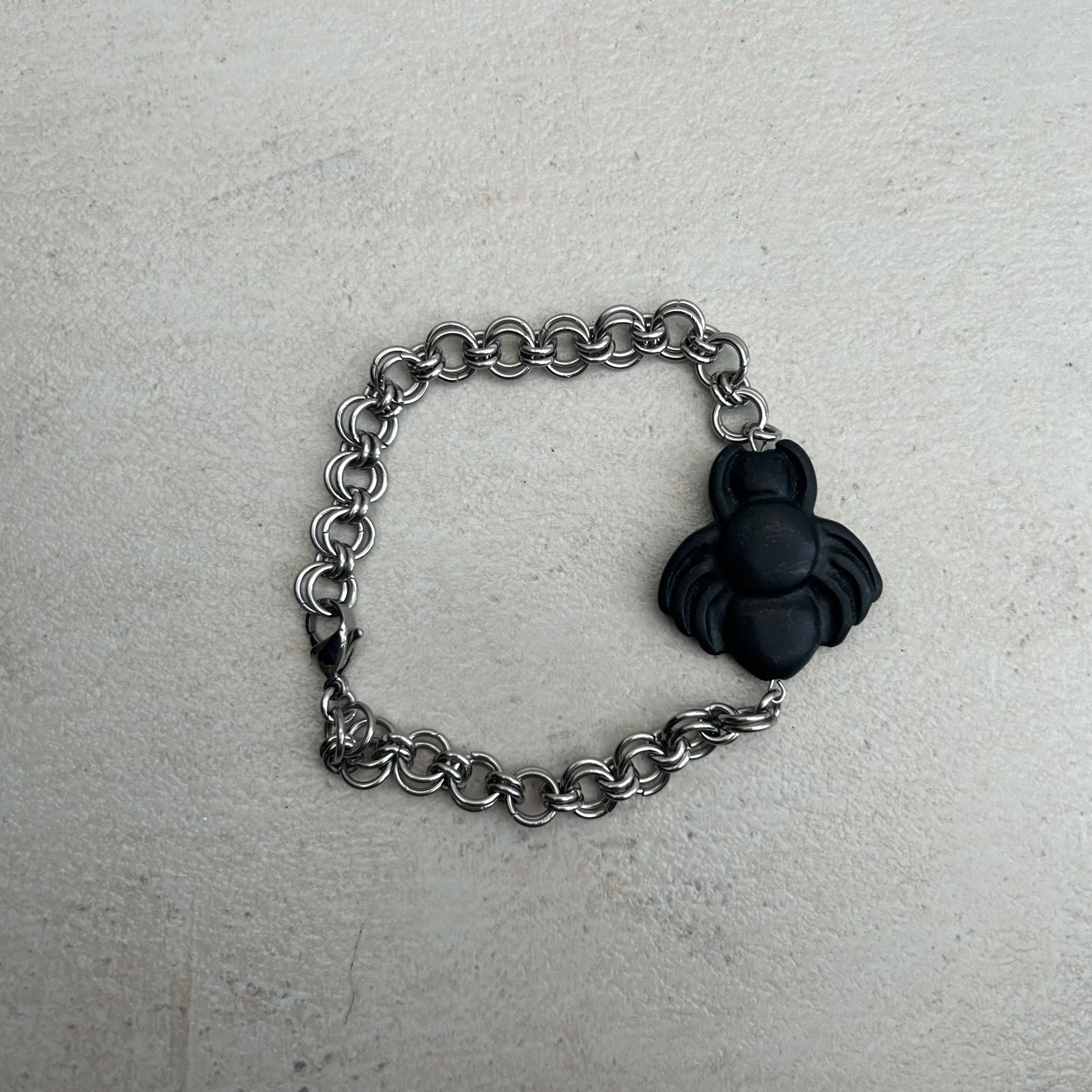 Stainless steel Chainmail bracelet with stone bead spider detailing. Measurements as shown.