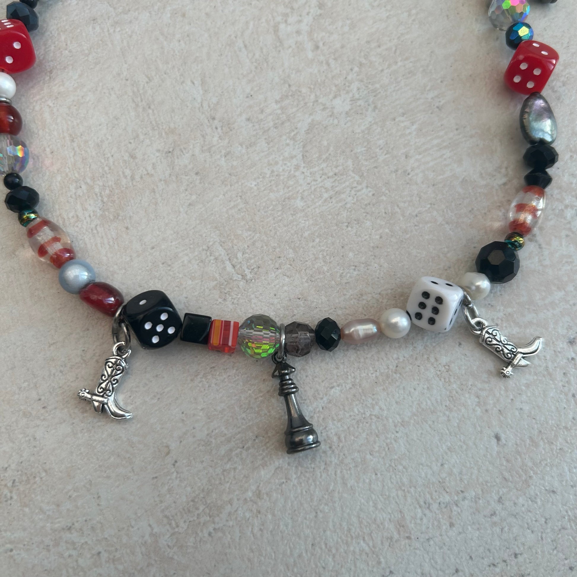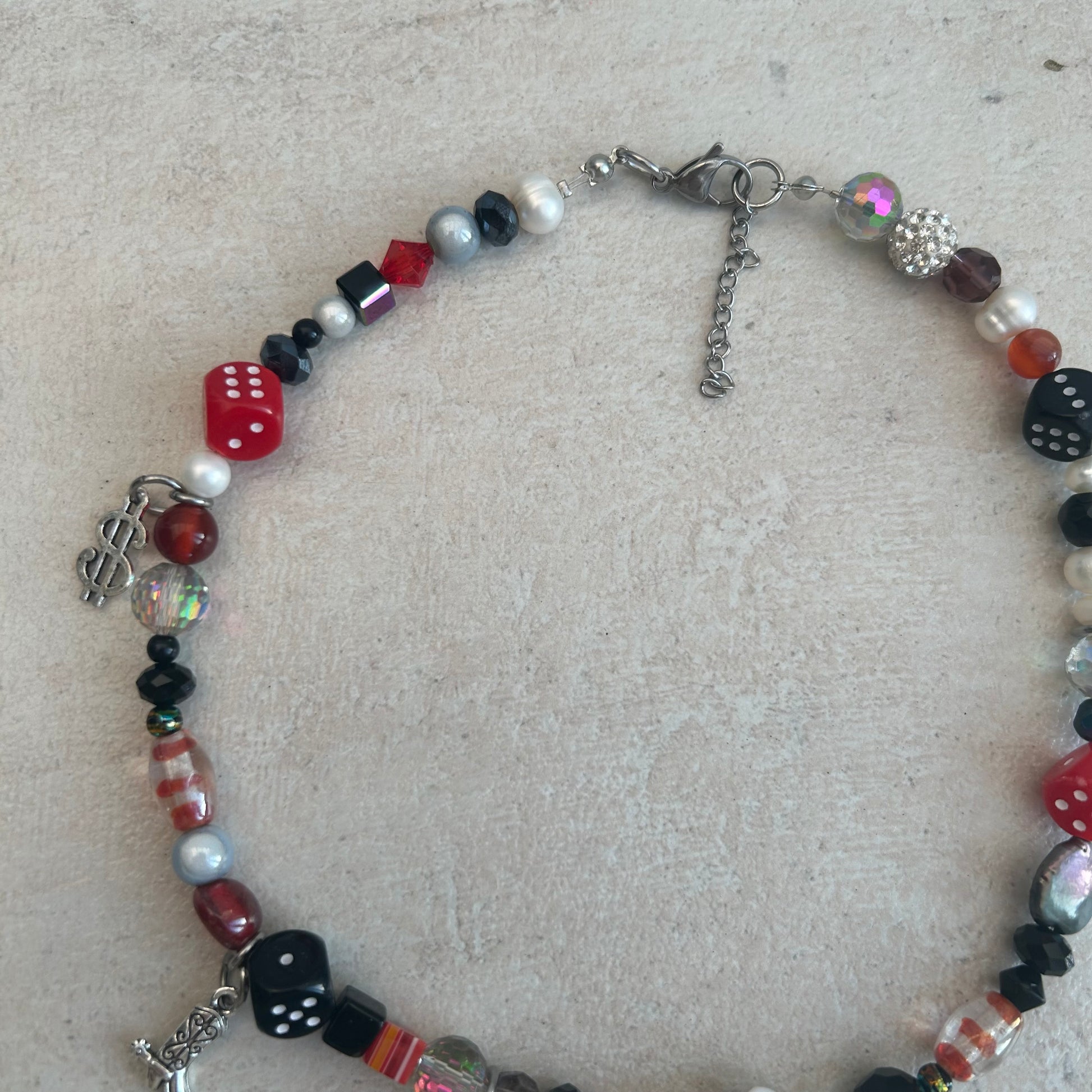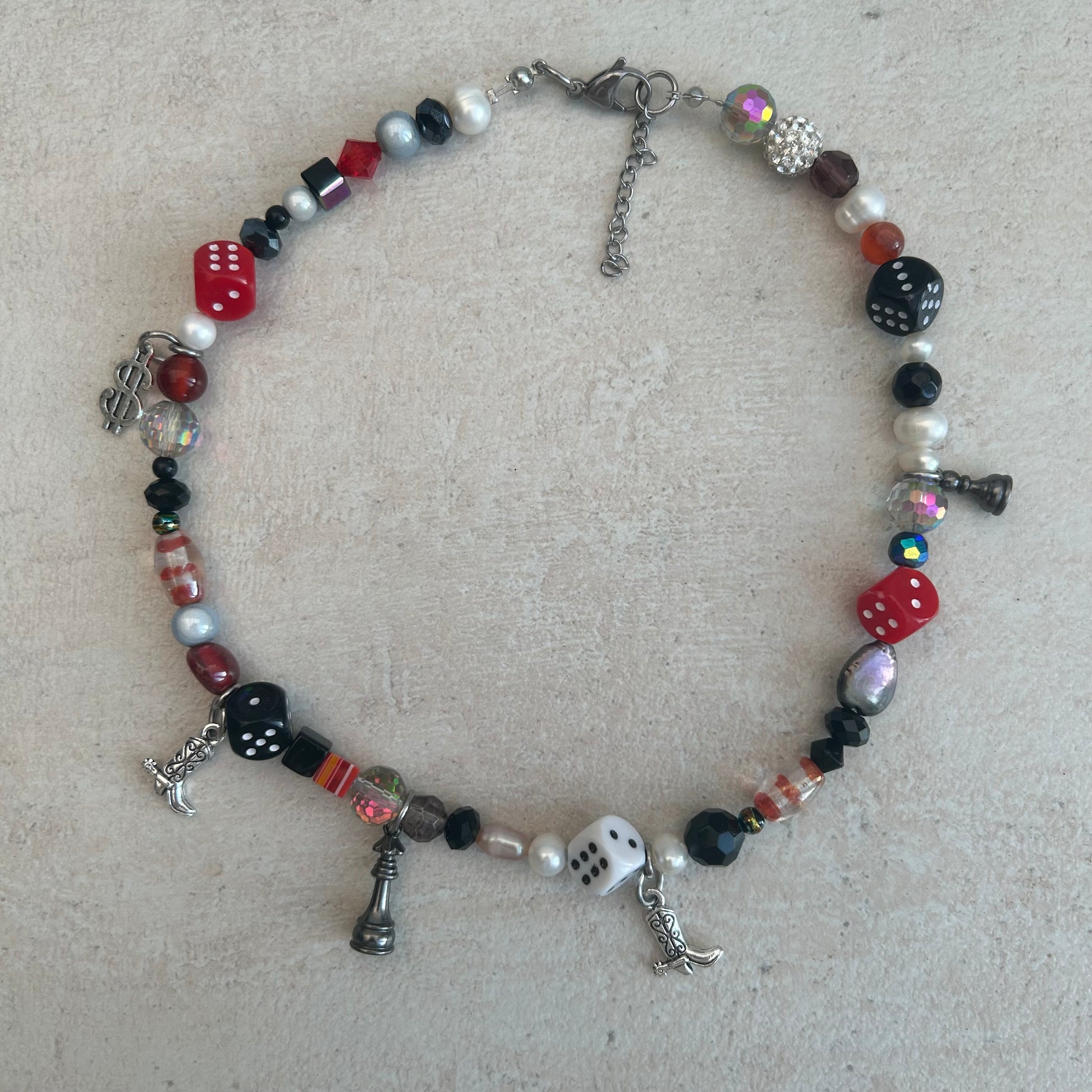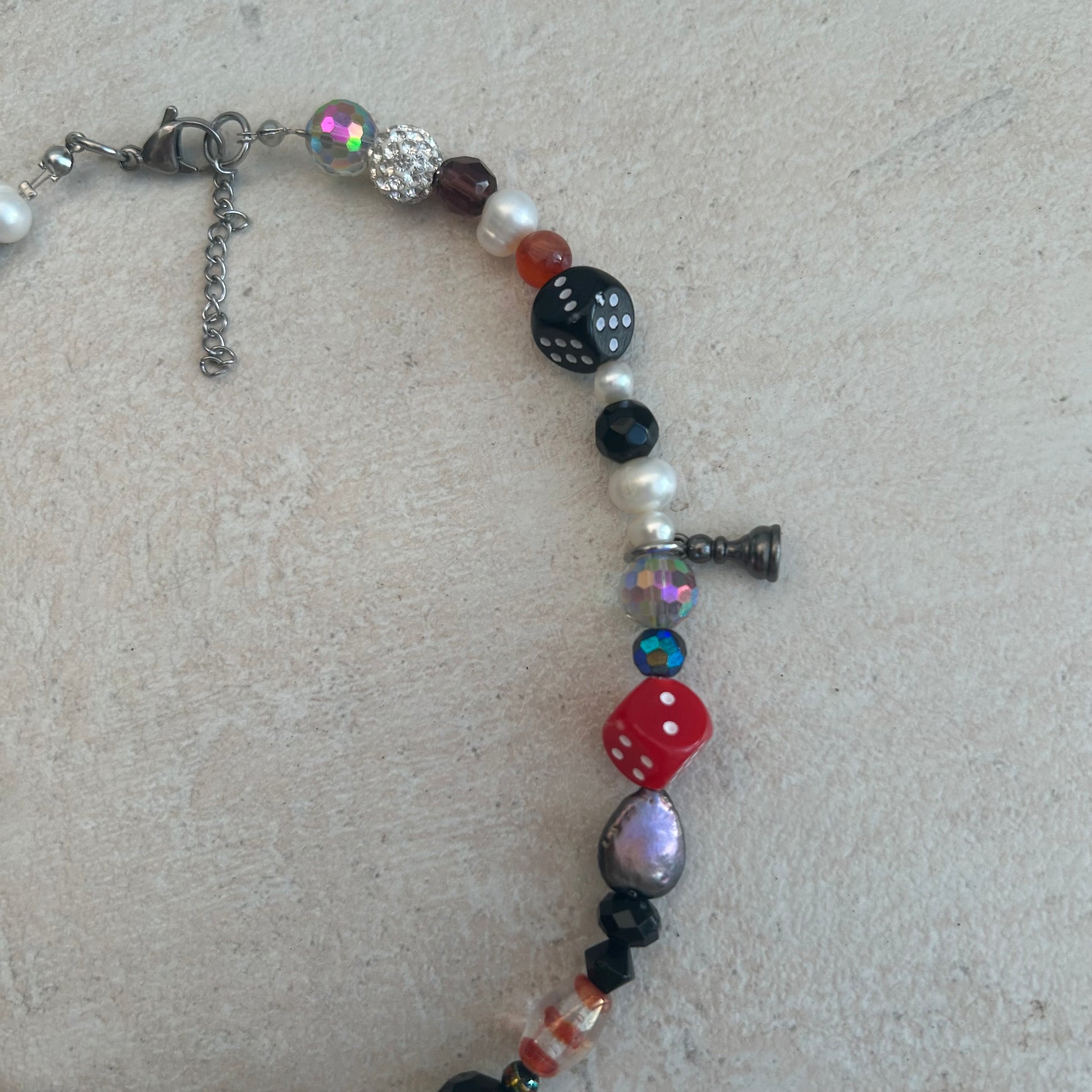 made with freshwater pearls, glass beads, acrylic beads and mixed charms.