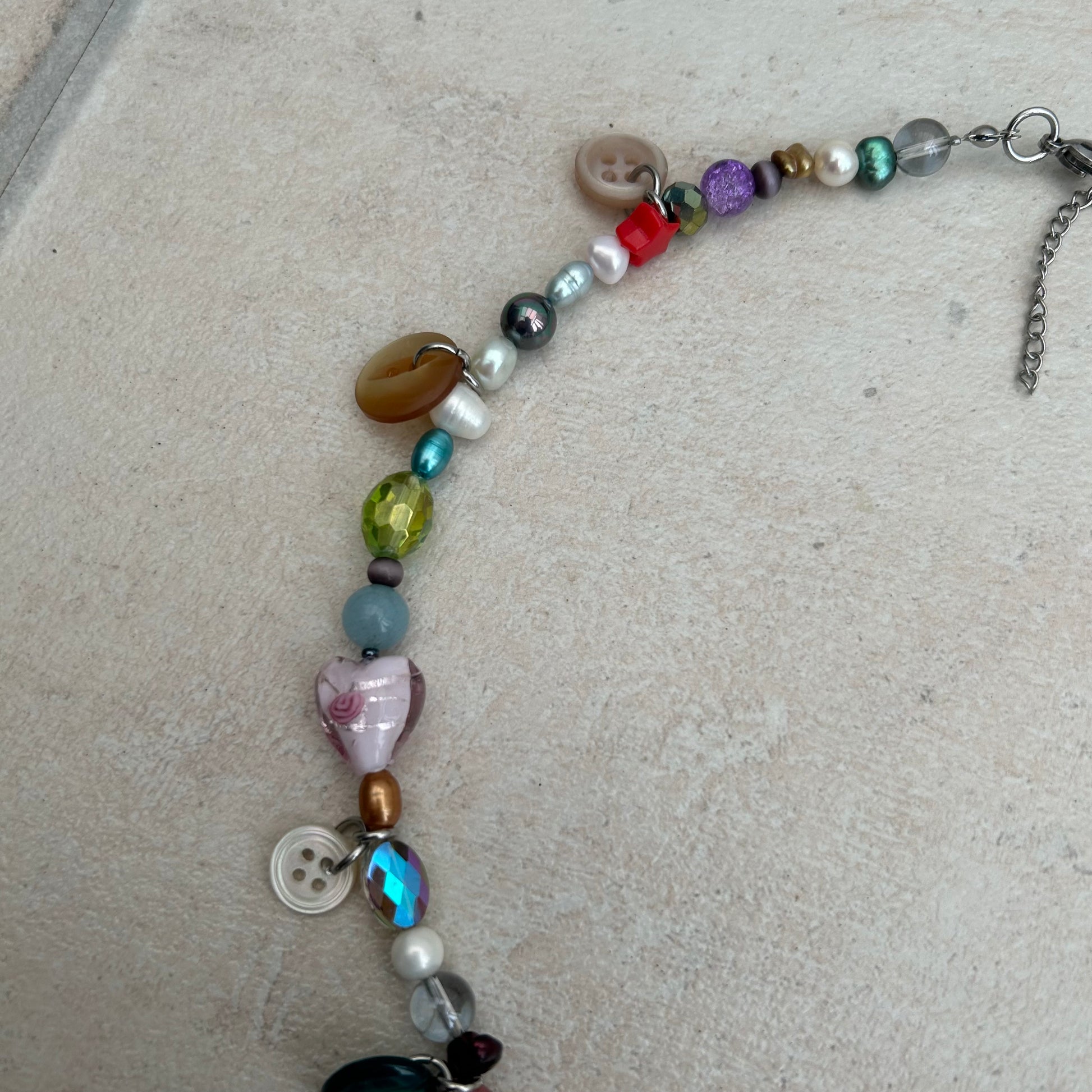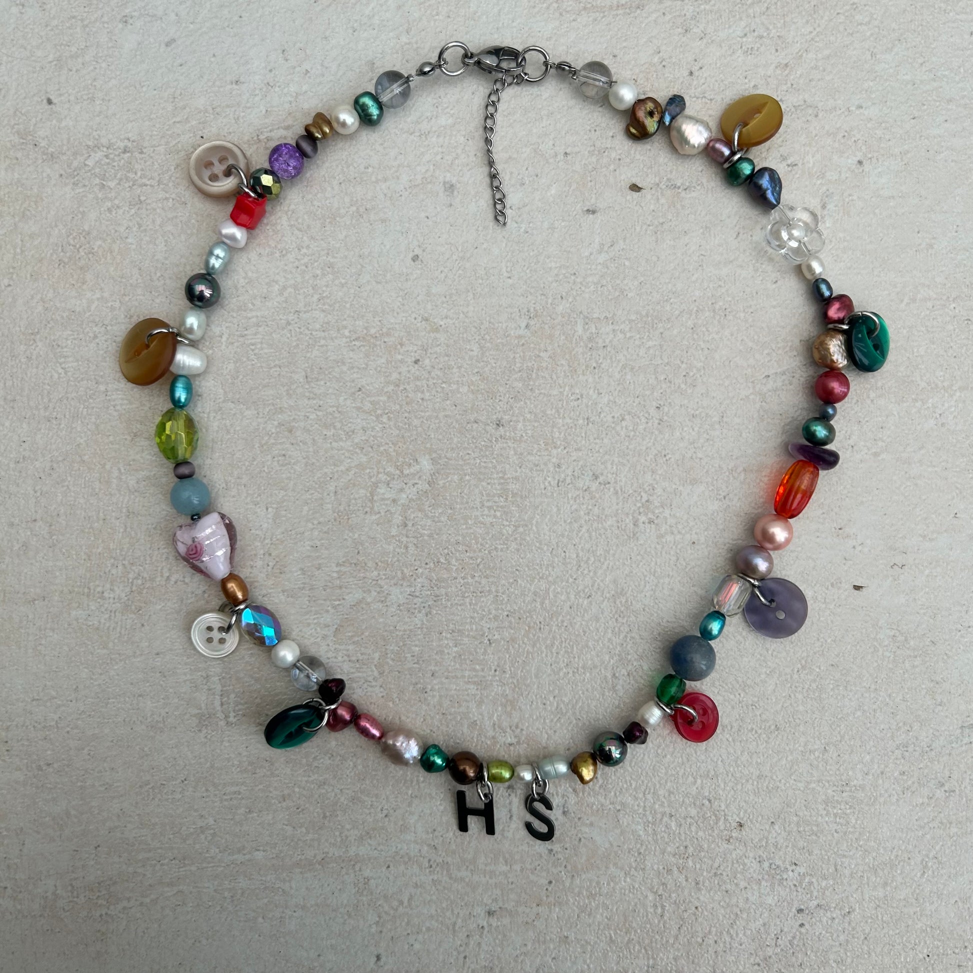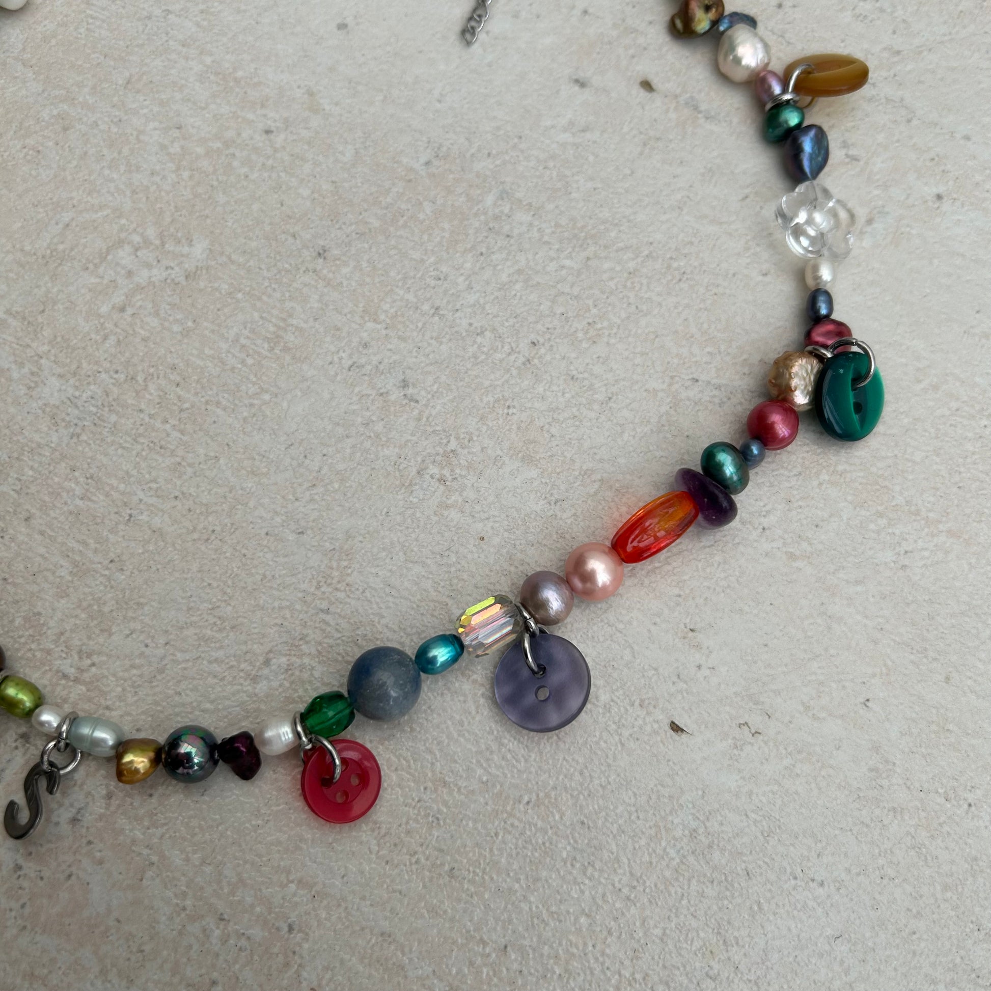 made with glass beads, freshwater pearls, acrylic beads and upcycled buttons and two stainless steel letter charms.