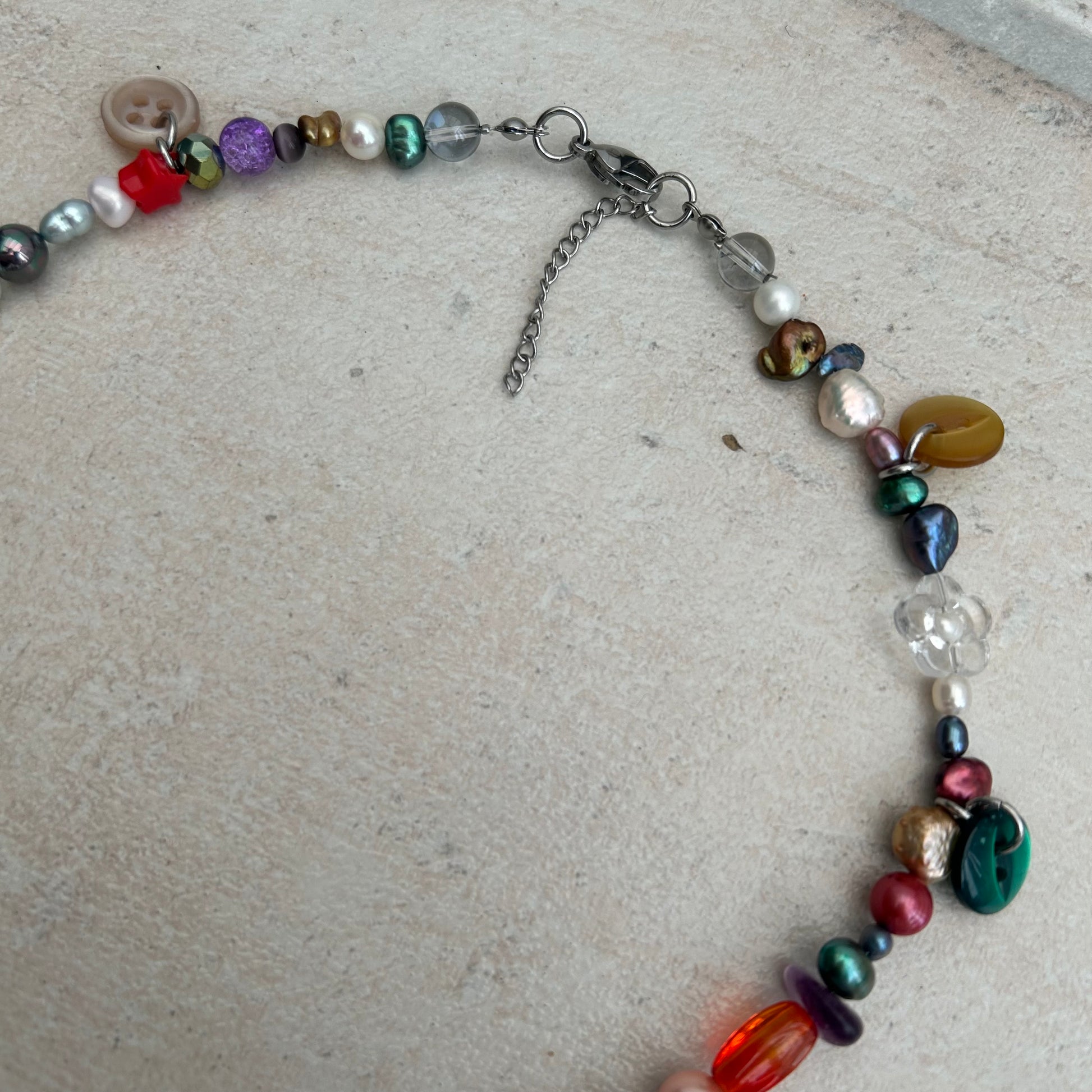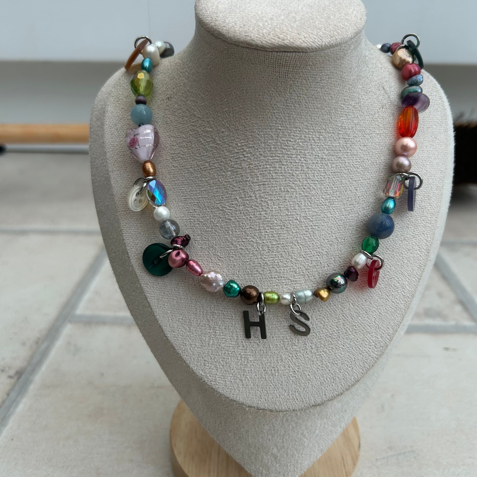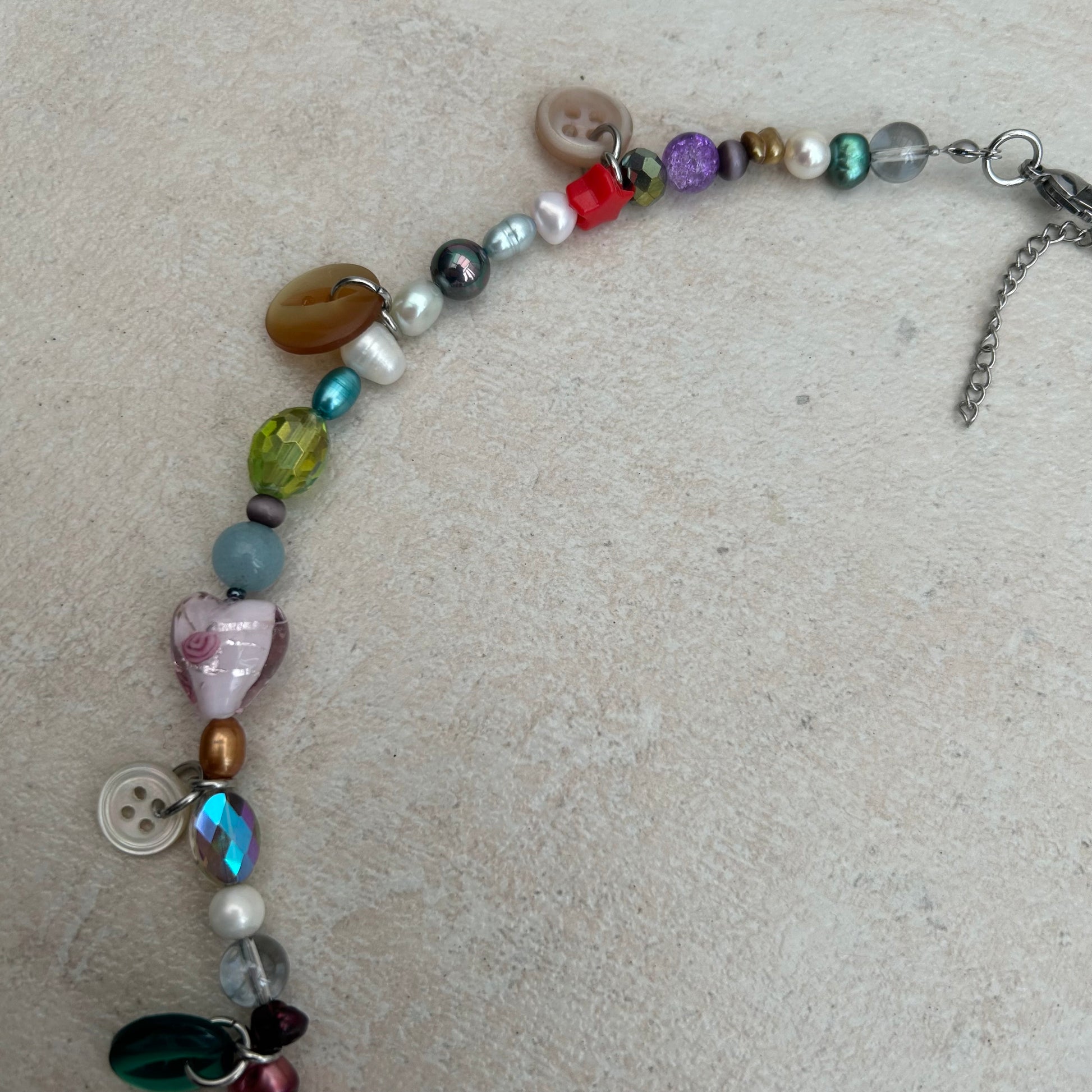 made with glass beads, freshwater pearls, acrylic beads and upcycled buttons and two stainless steel letter charms.