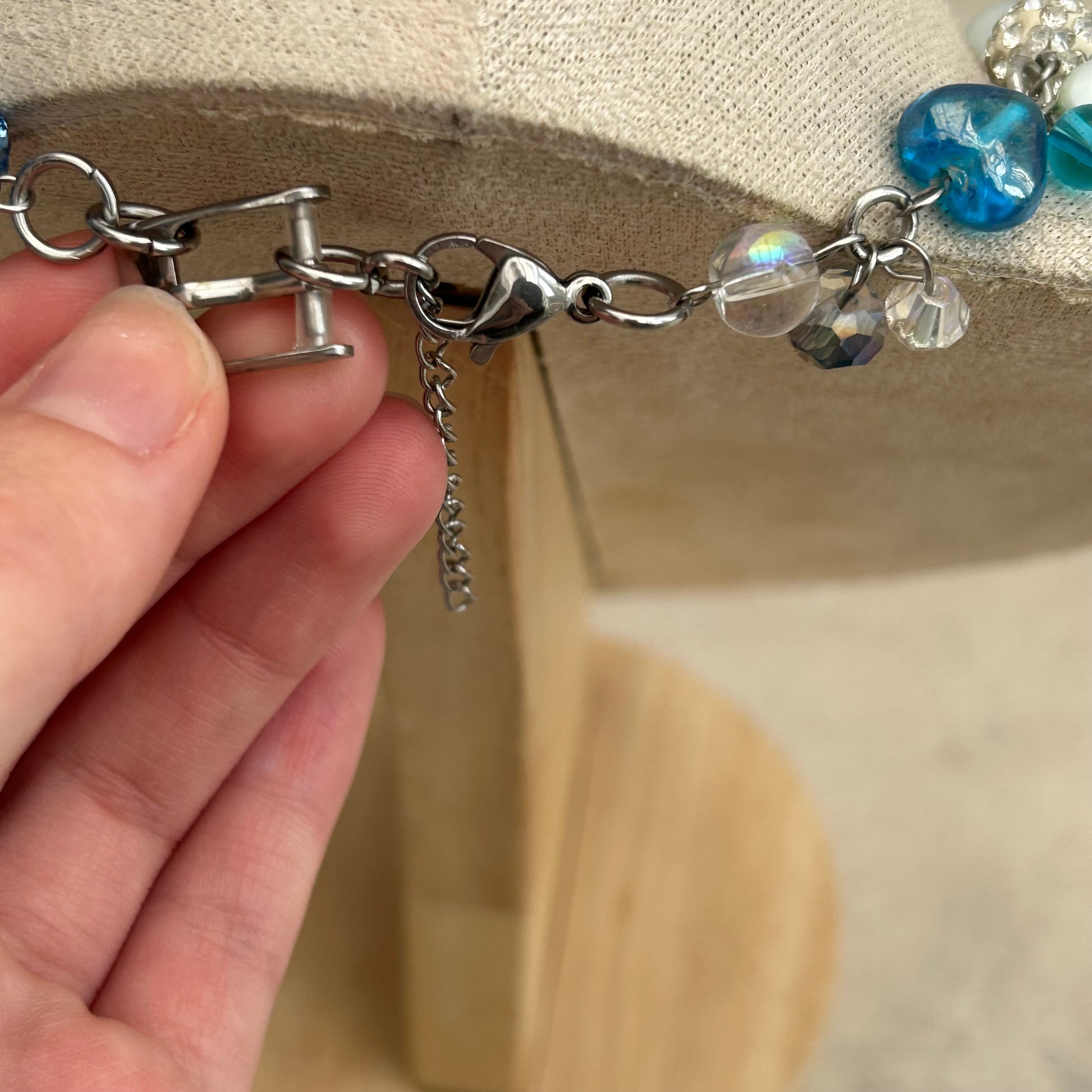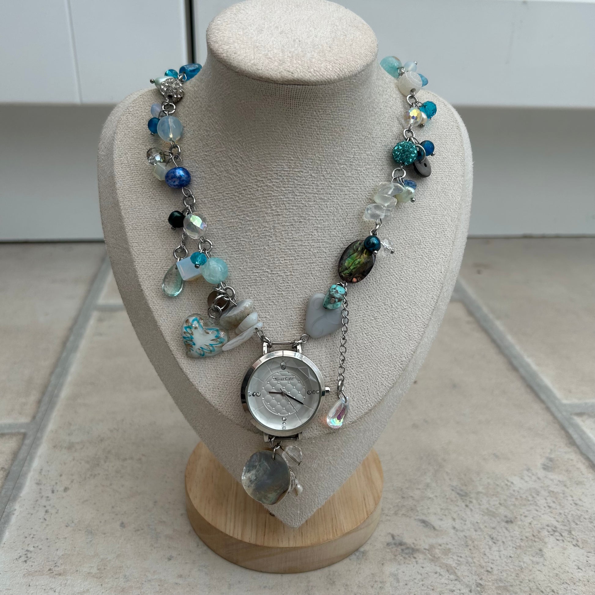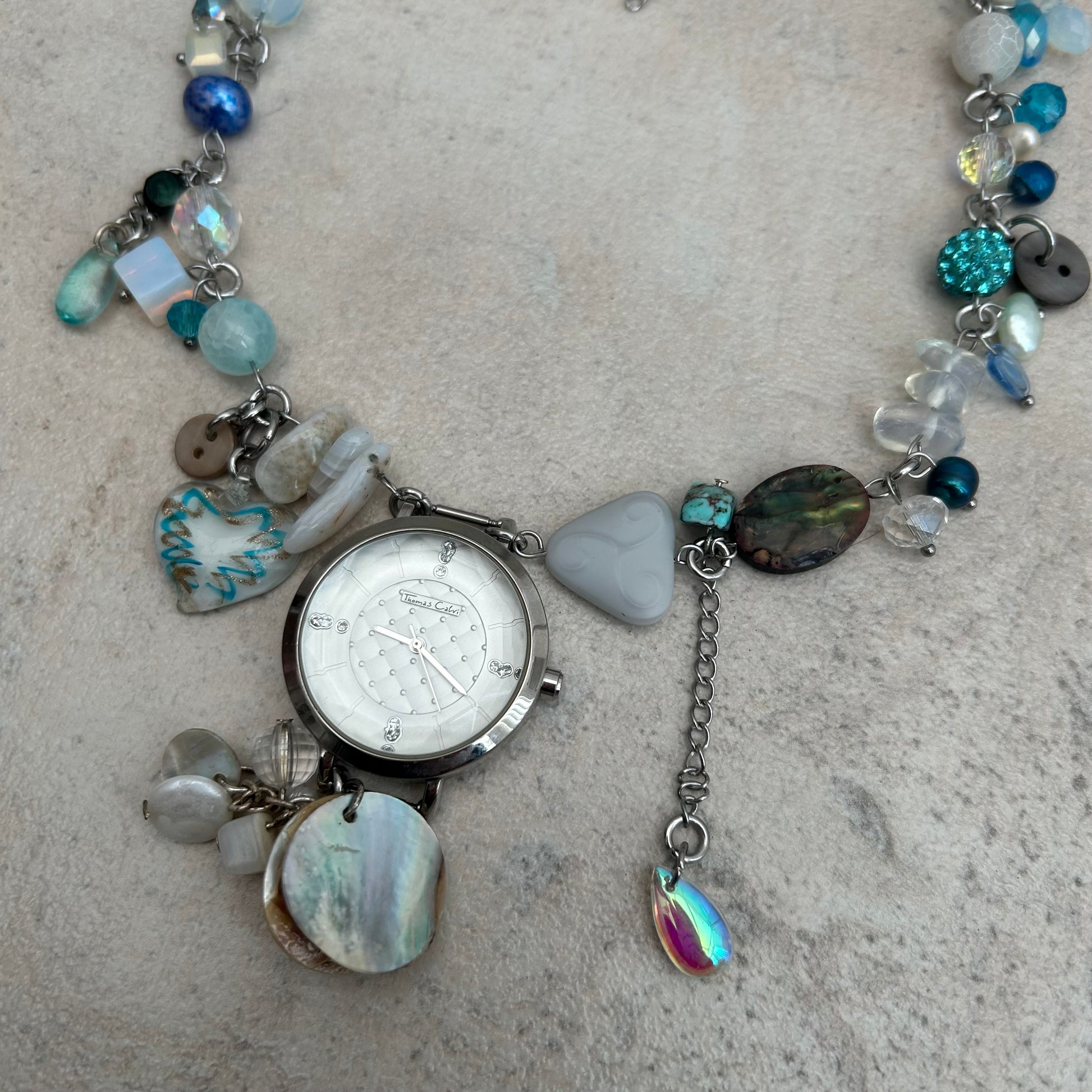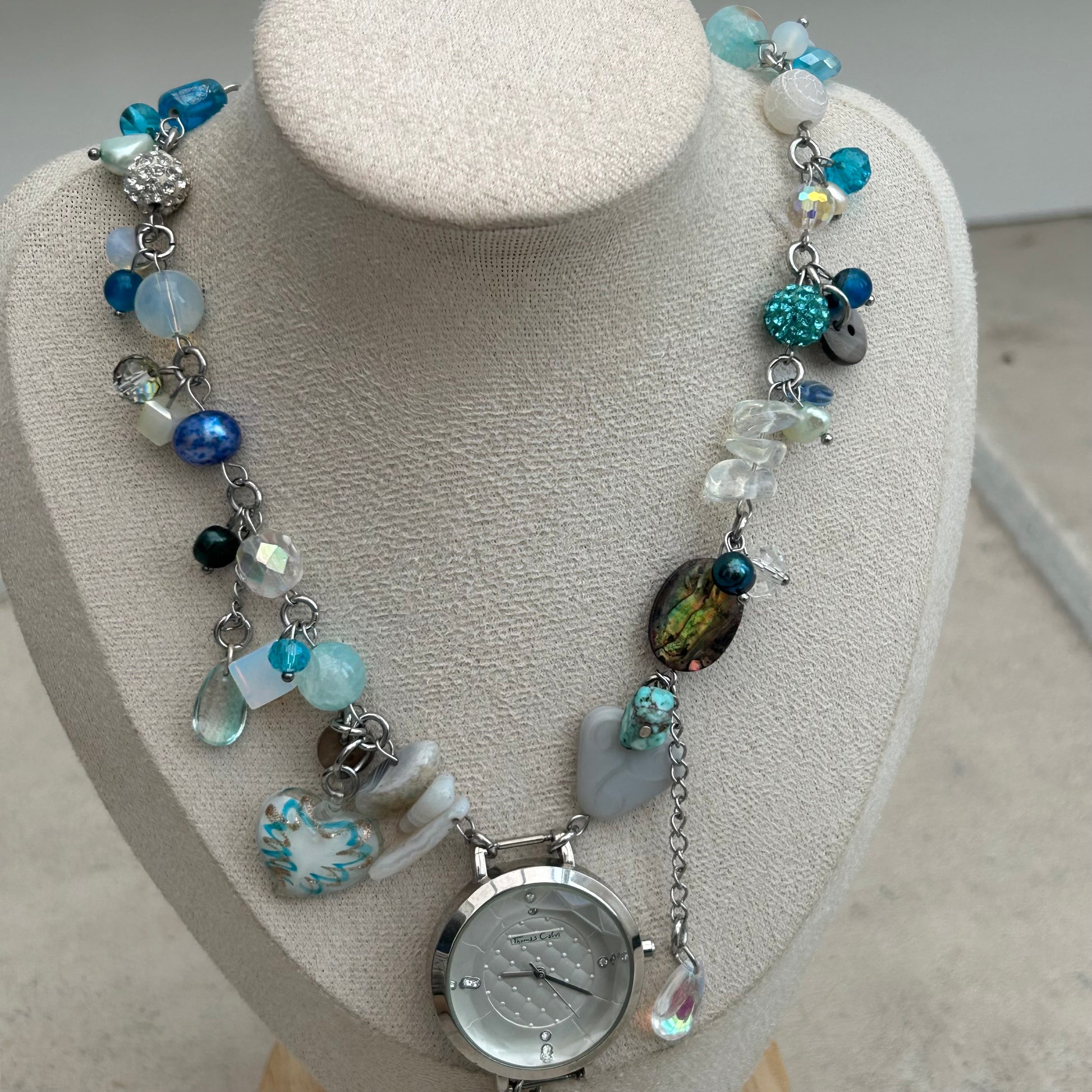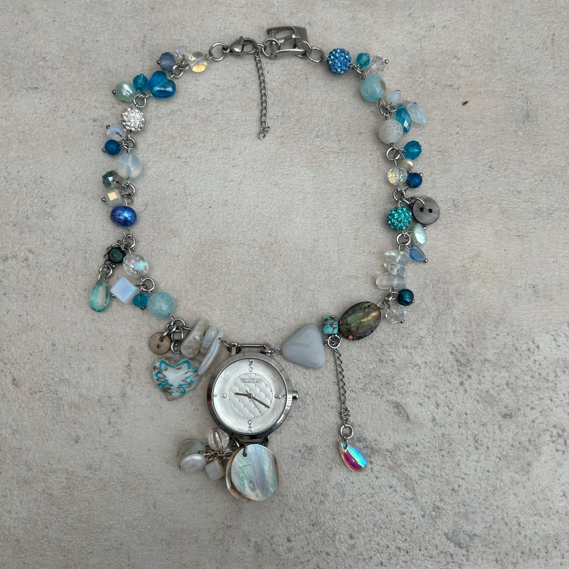 stainless steel findings, glass beads, freshwater petals, opal chips, abalone pieces, crystal beads, glass droplets, glass lampwork heart charm, agate chips, upcycled buttons, precious stone beads, mother of pearl charm and watch buckle piece.