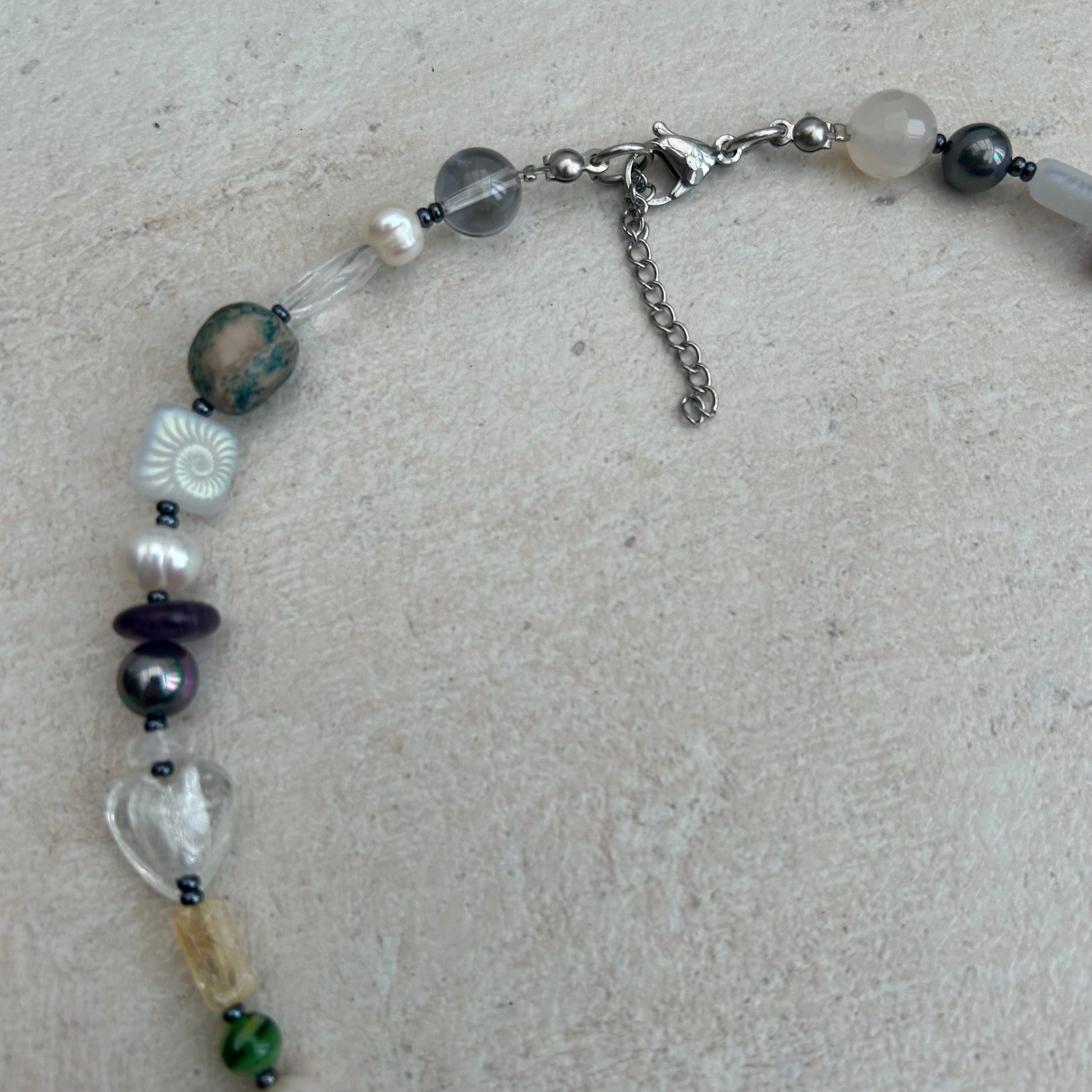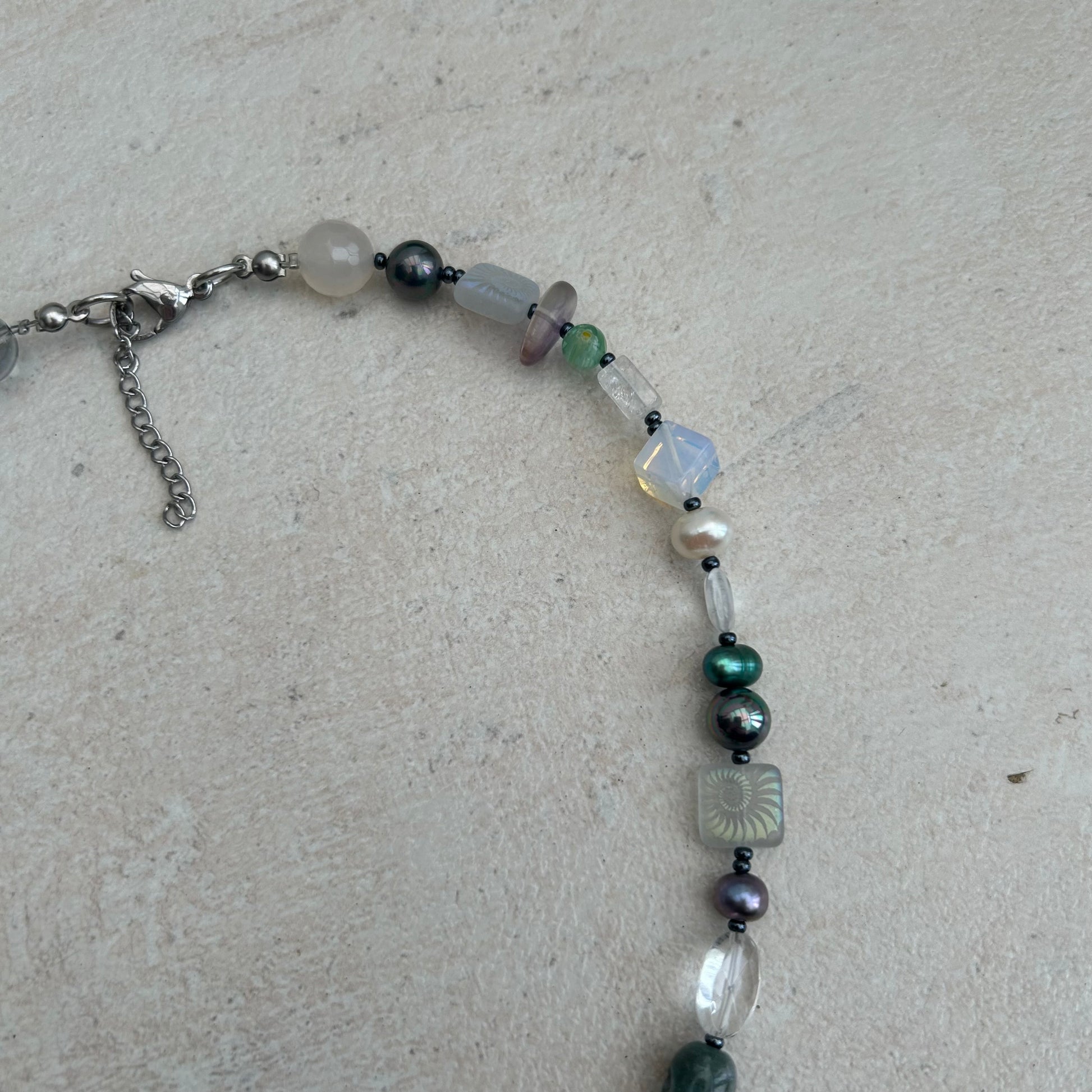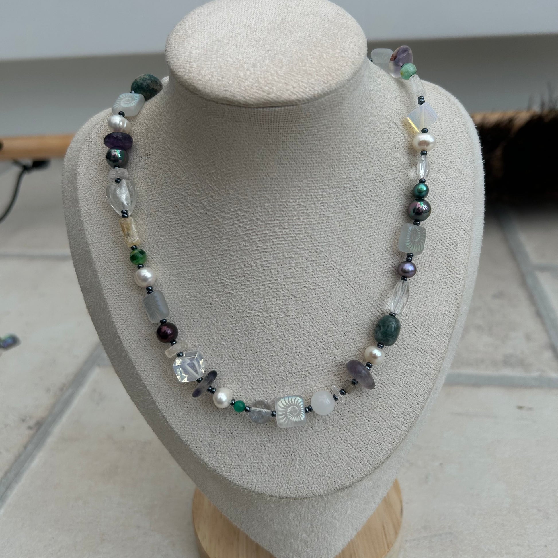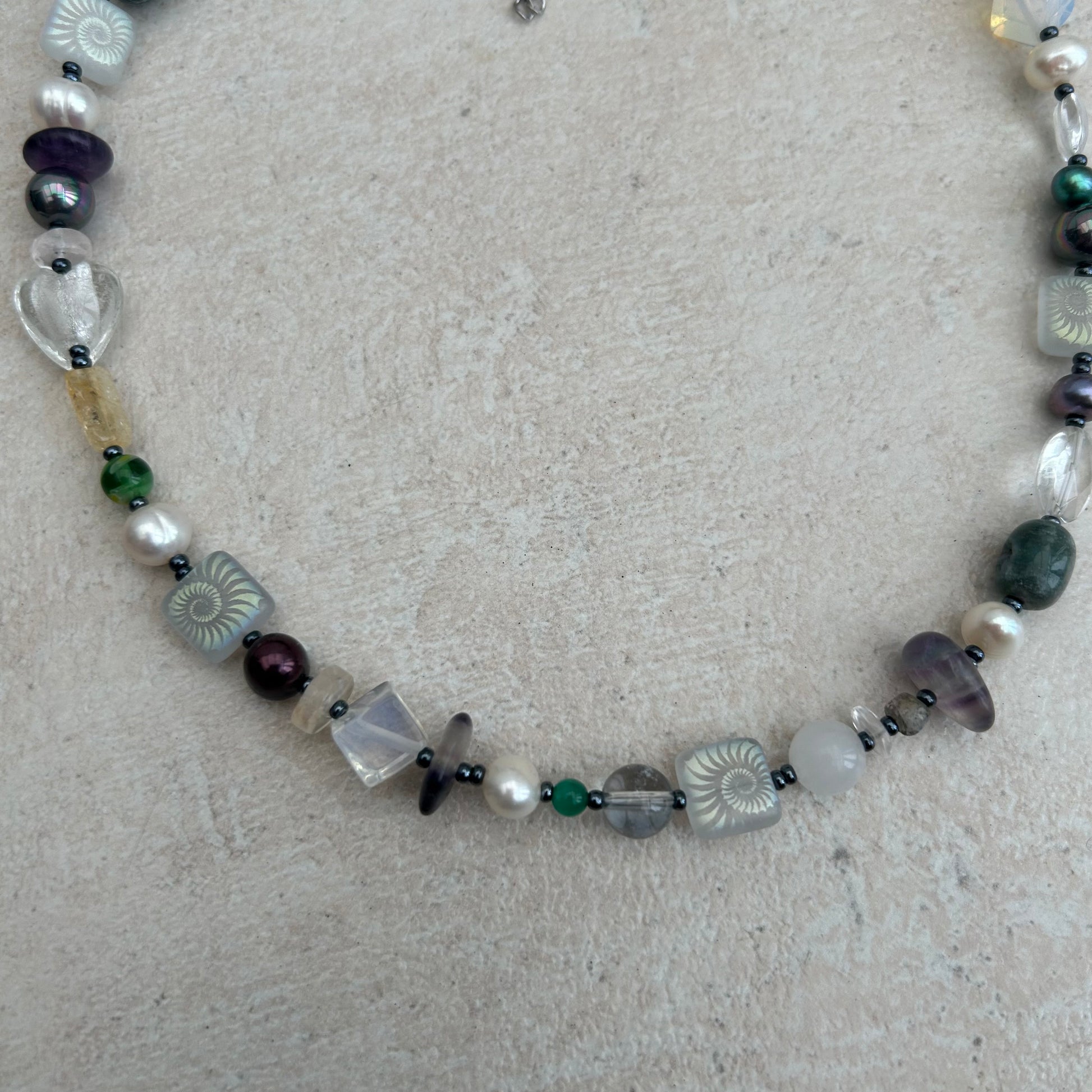 The Mila necklace is made with freshwater pearls, glass seed beads, glass beads, laser etched glass beads, moonstone crystal chips.