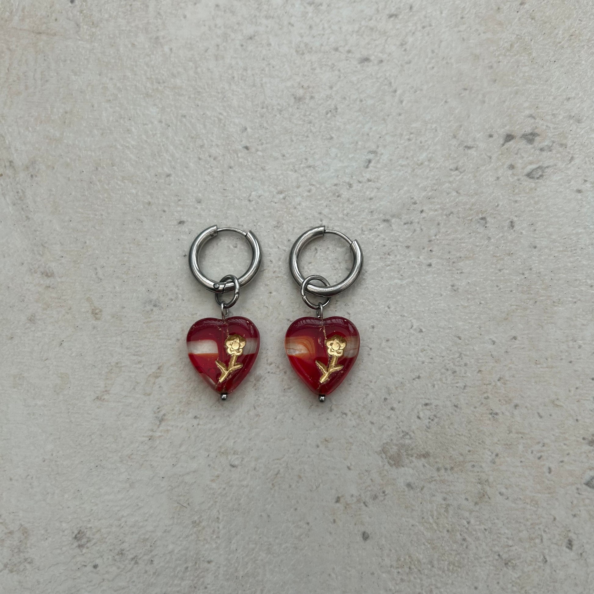 Czech glass flower heart beads on stainless steel hypoallergenic steel hoop earrings