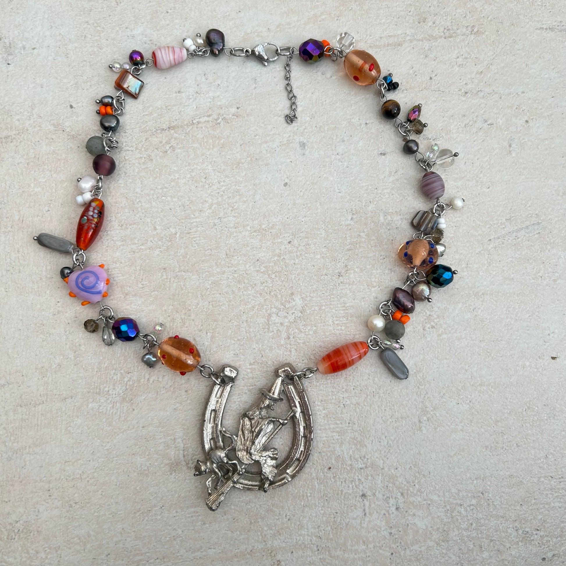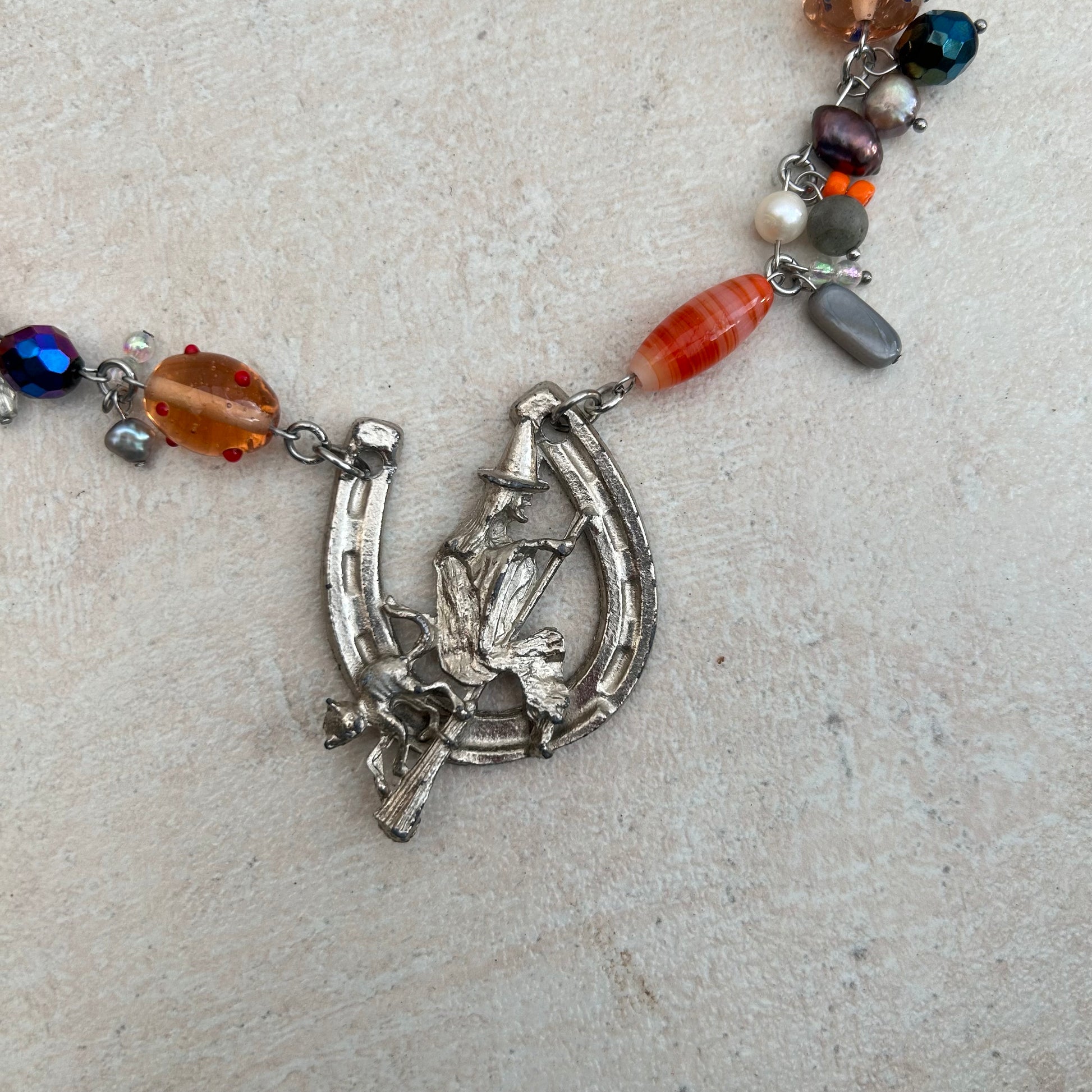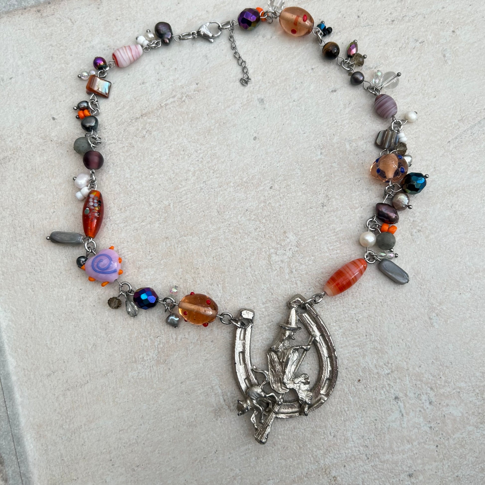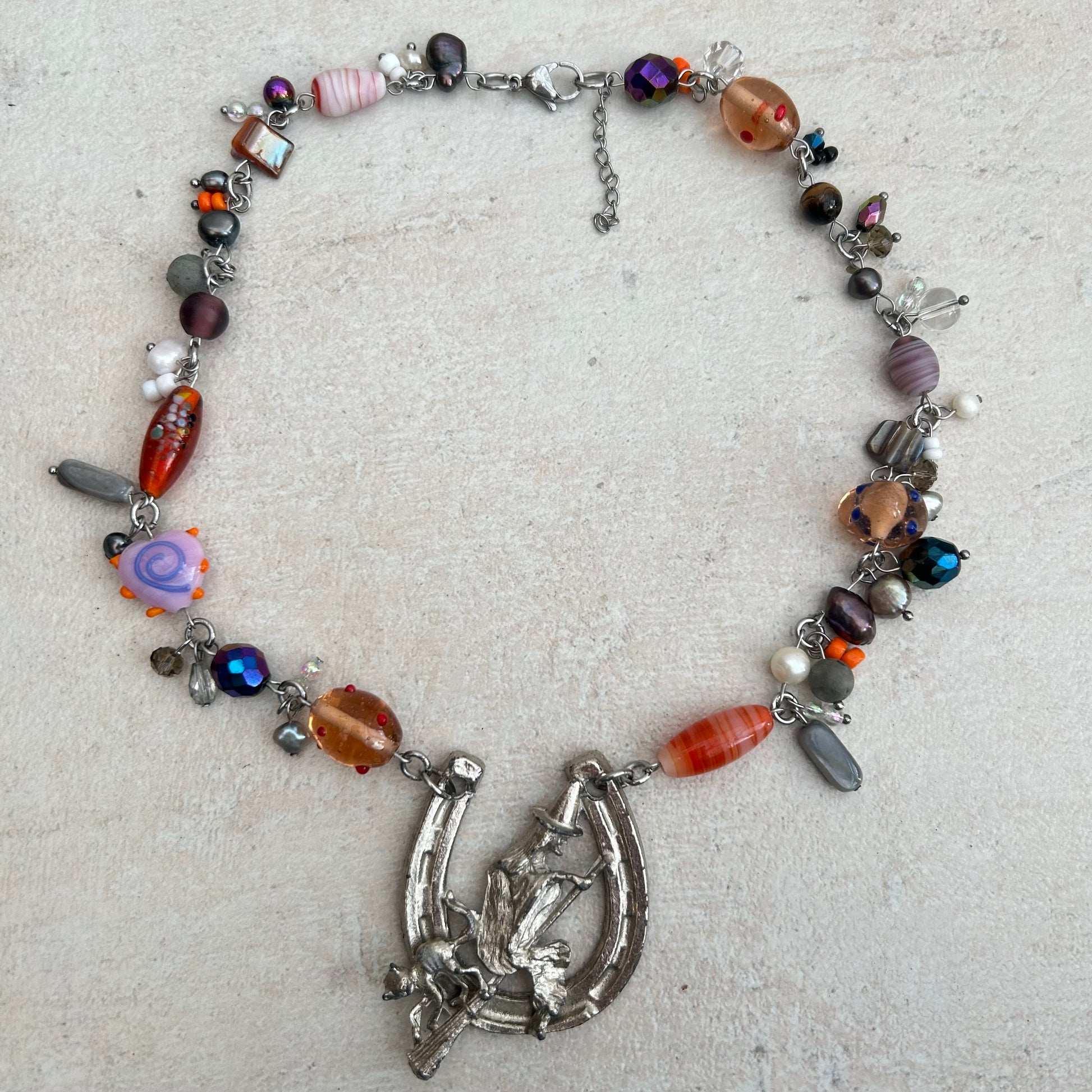 Cluster clutter glass lanprwork and stainless steel necklace with vintage witch and cat pendant