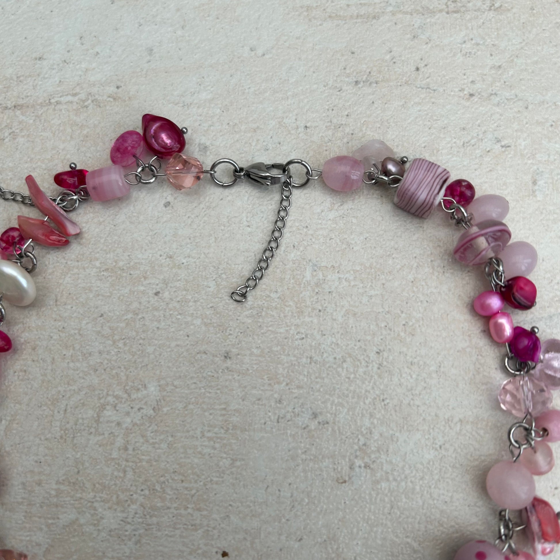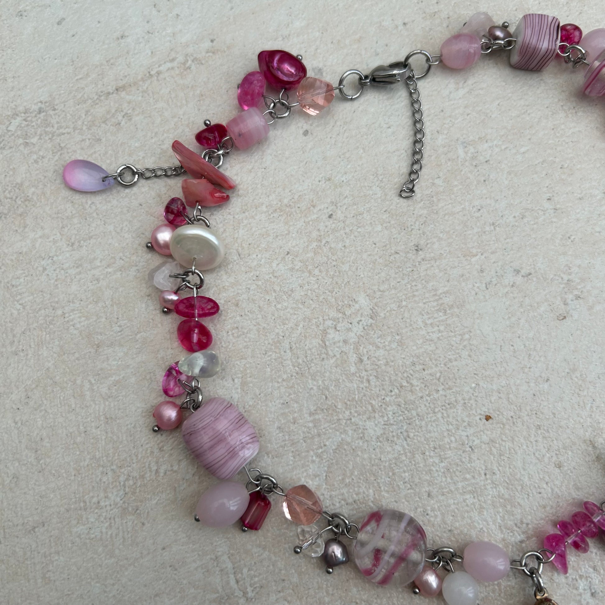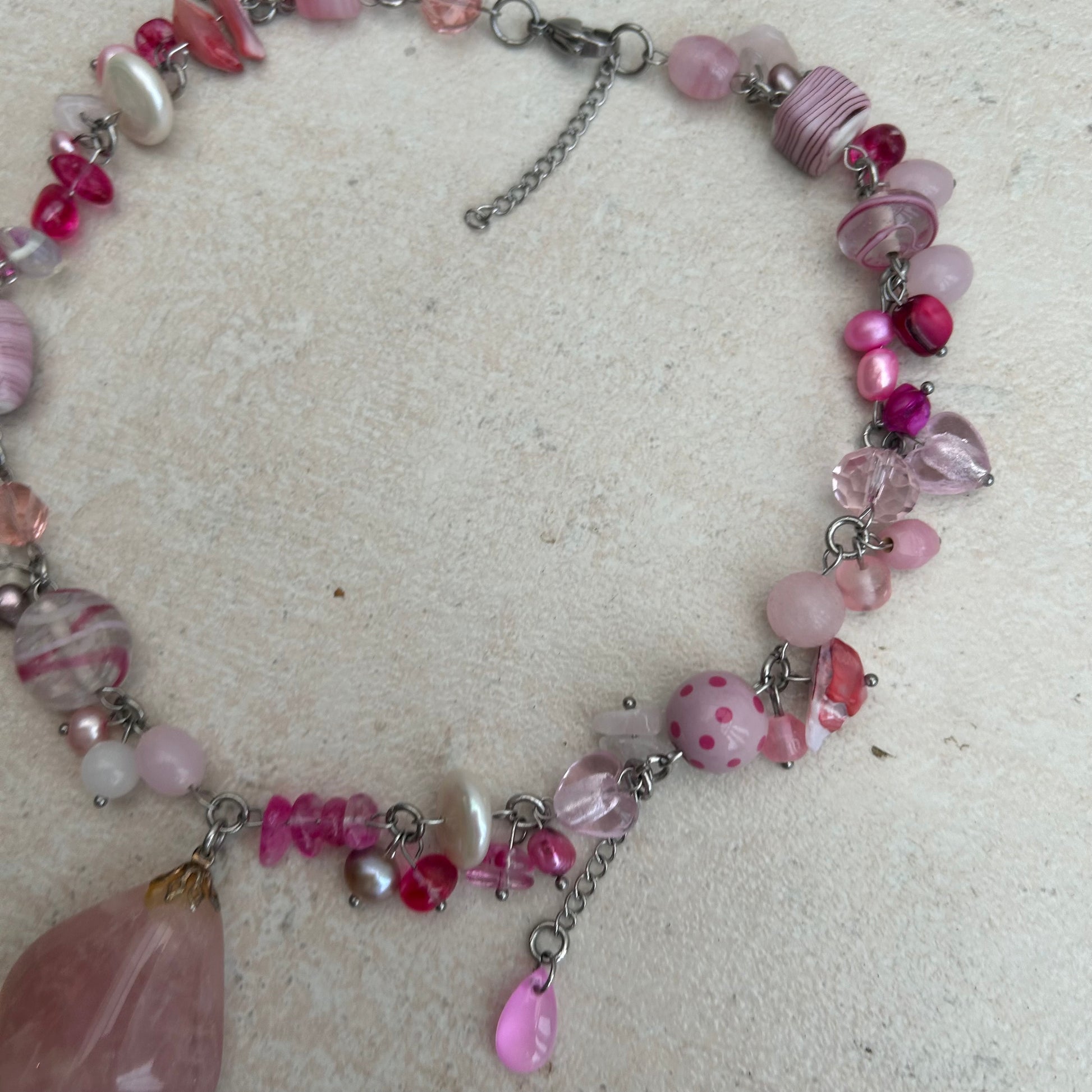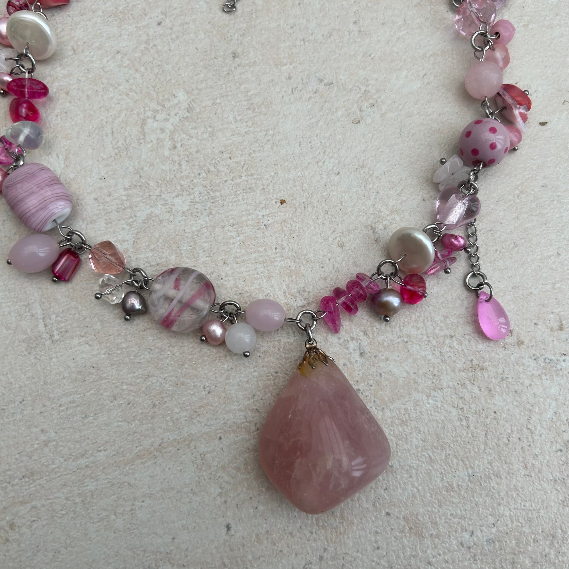 Rose/strawberry quests stone pendant with glass beads, freshwater pearls and stainless steel findings