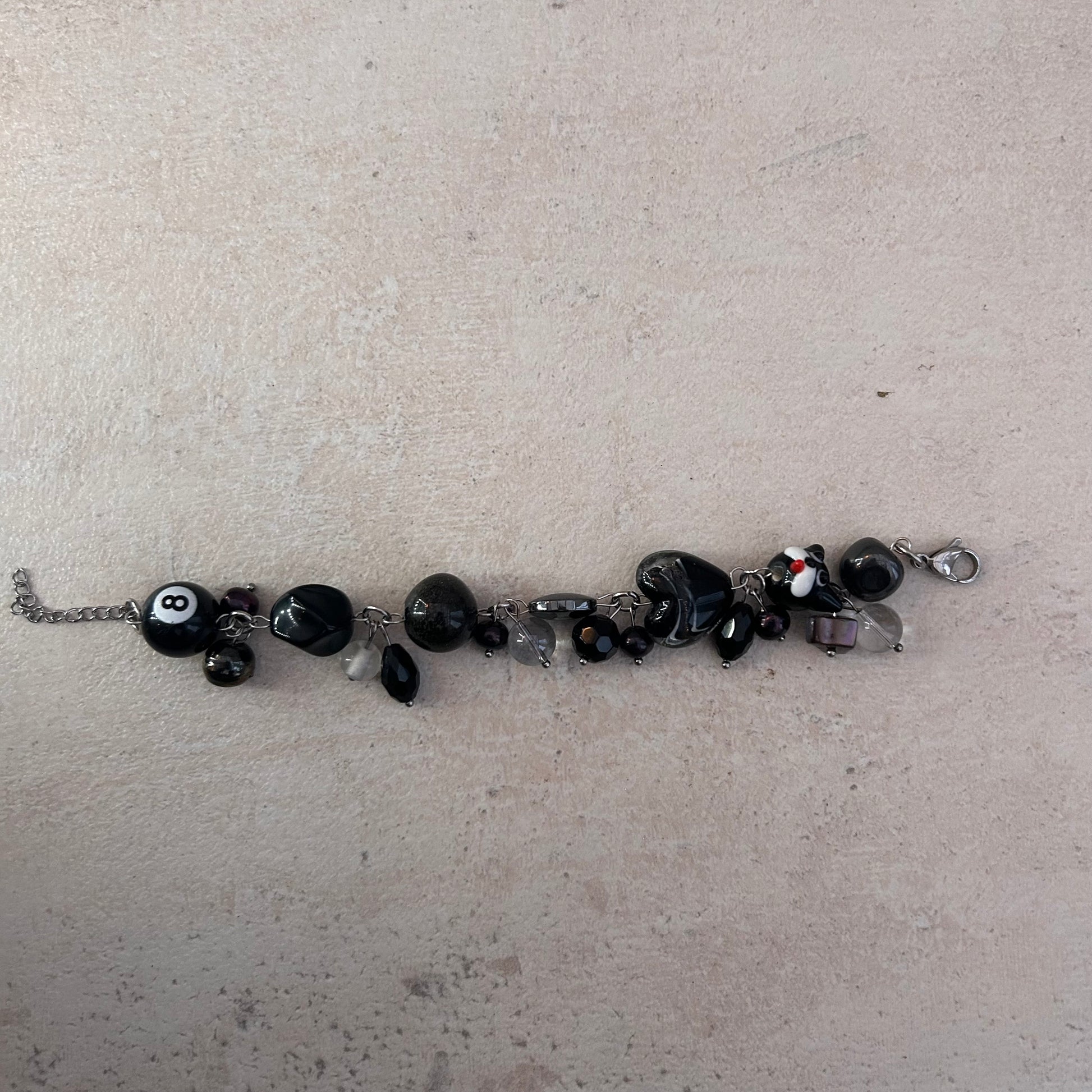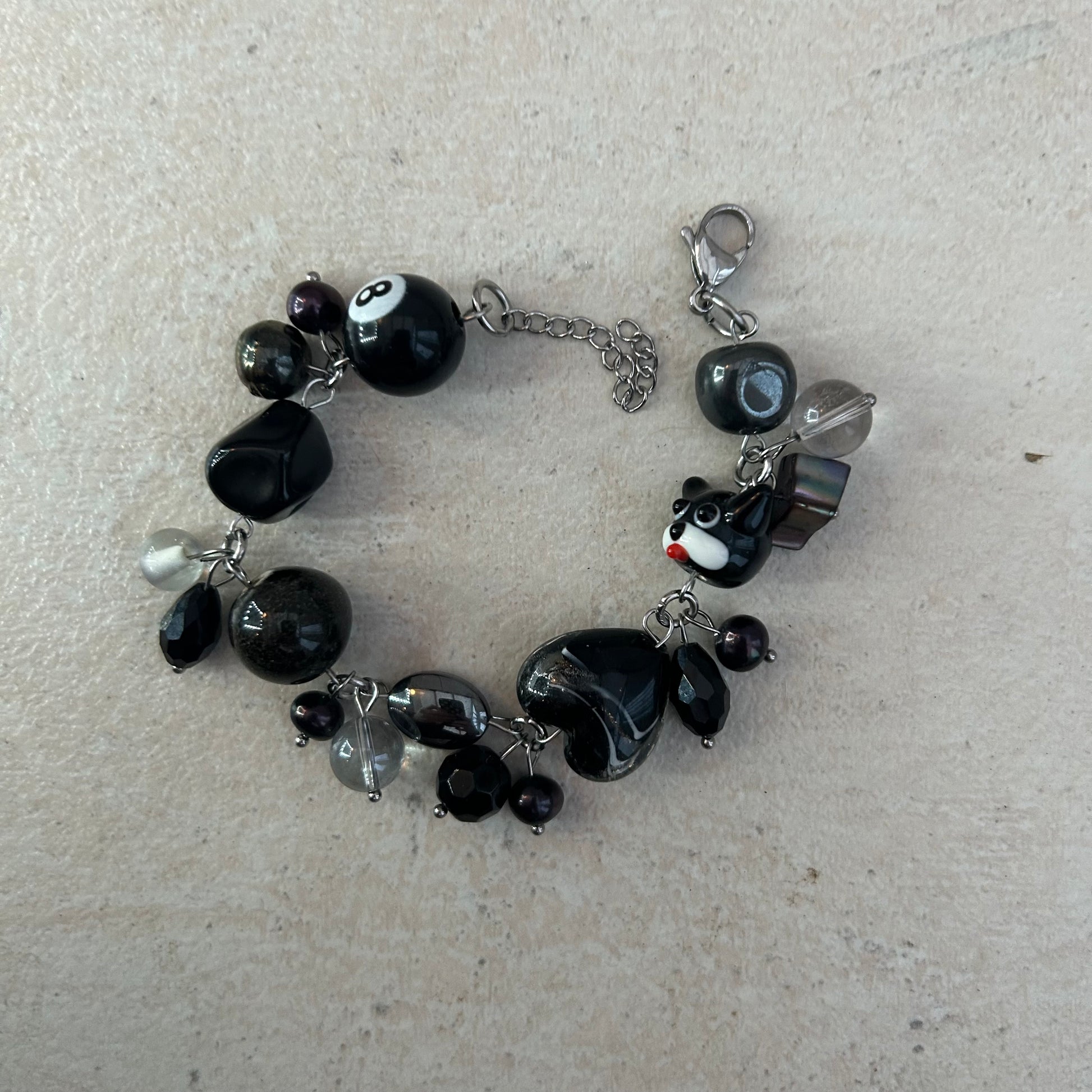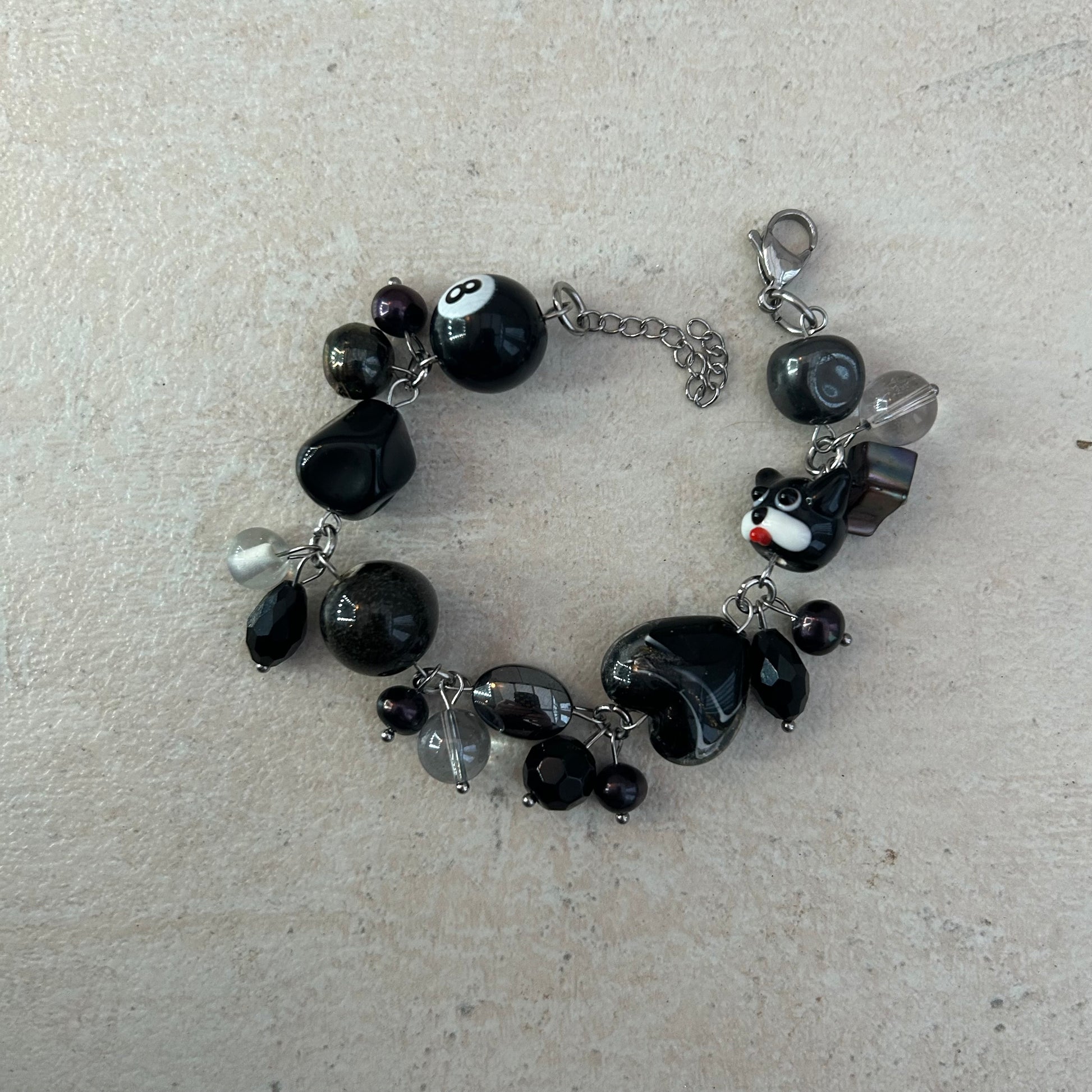 The black dog bracelet is made with glass lamp work beads, glass beads and freshwater pearls