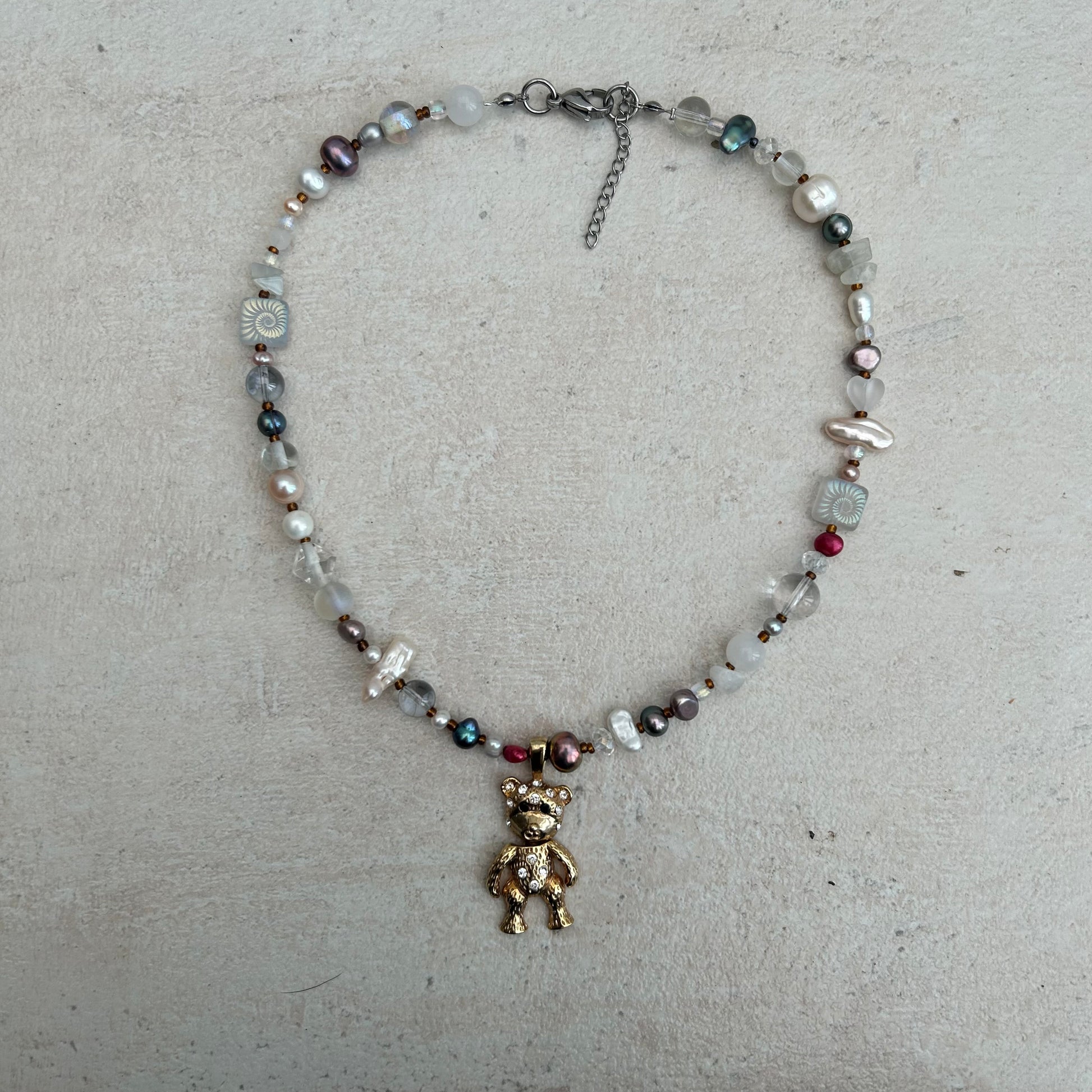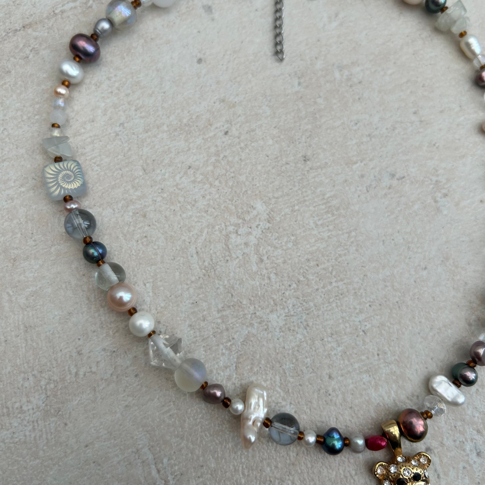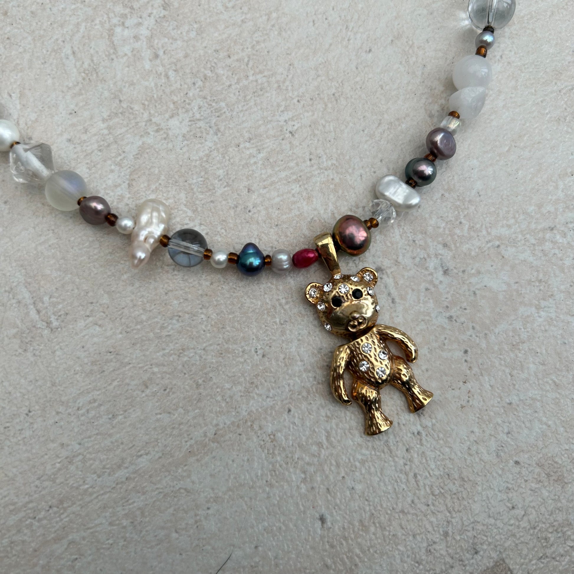 The Ros-ie necklace is made with freshwater pearls, glass seed beads, glass beads, laser etched glass beads, moonstone crystal chips and a vintage gold tone teddy bear rhinestone pendant.