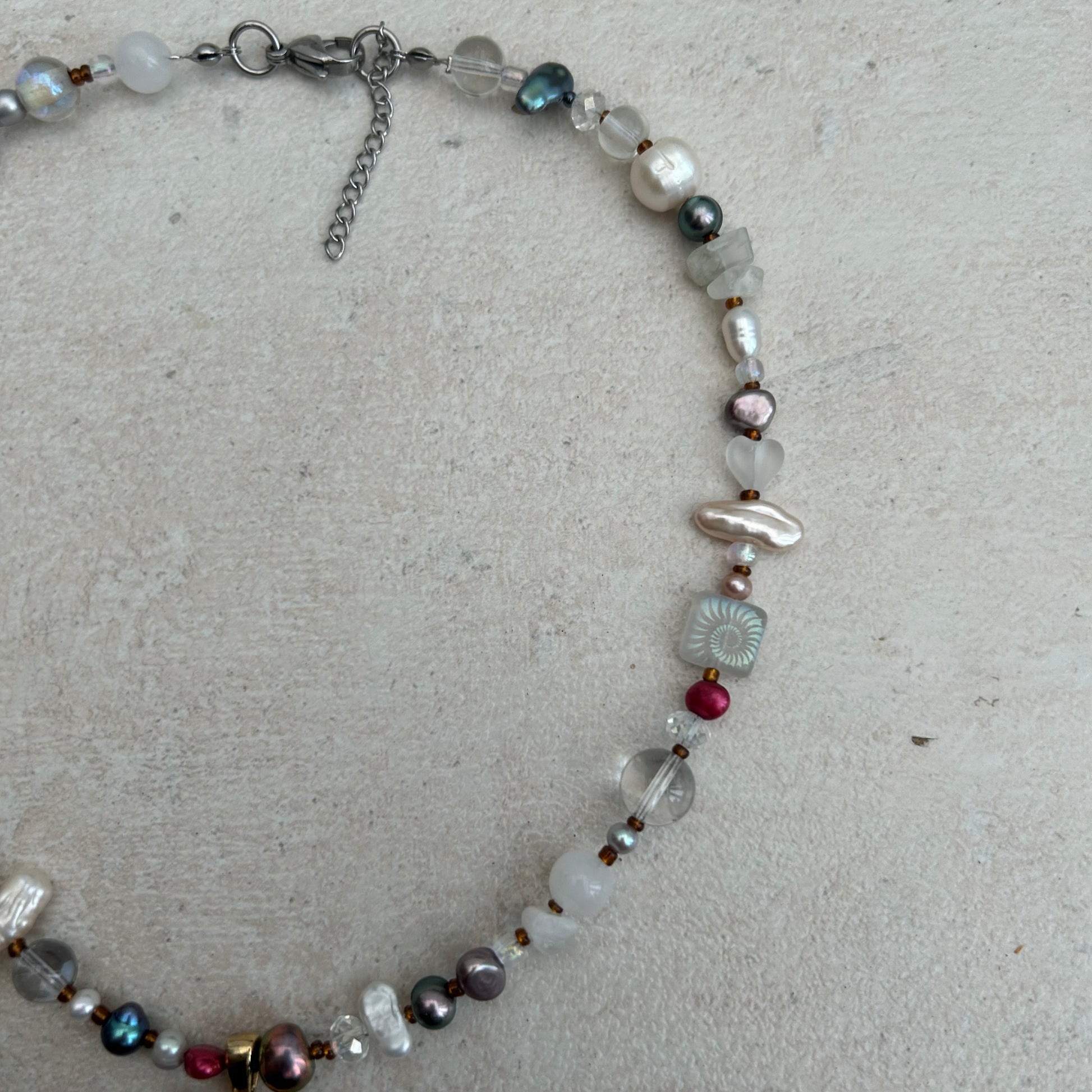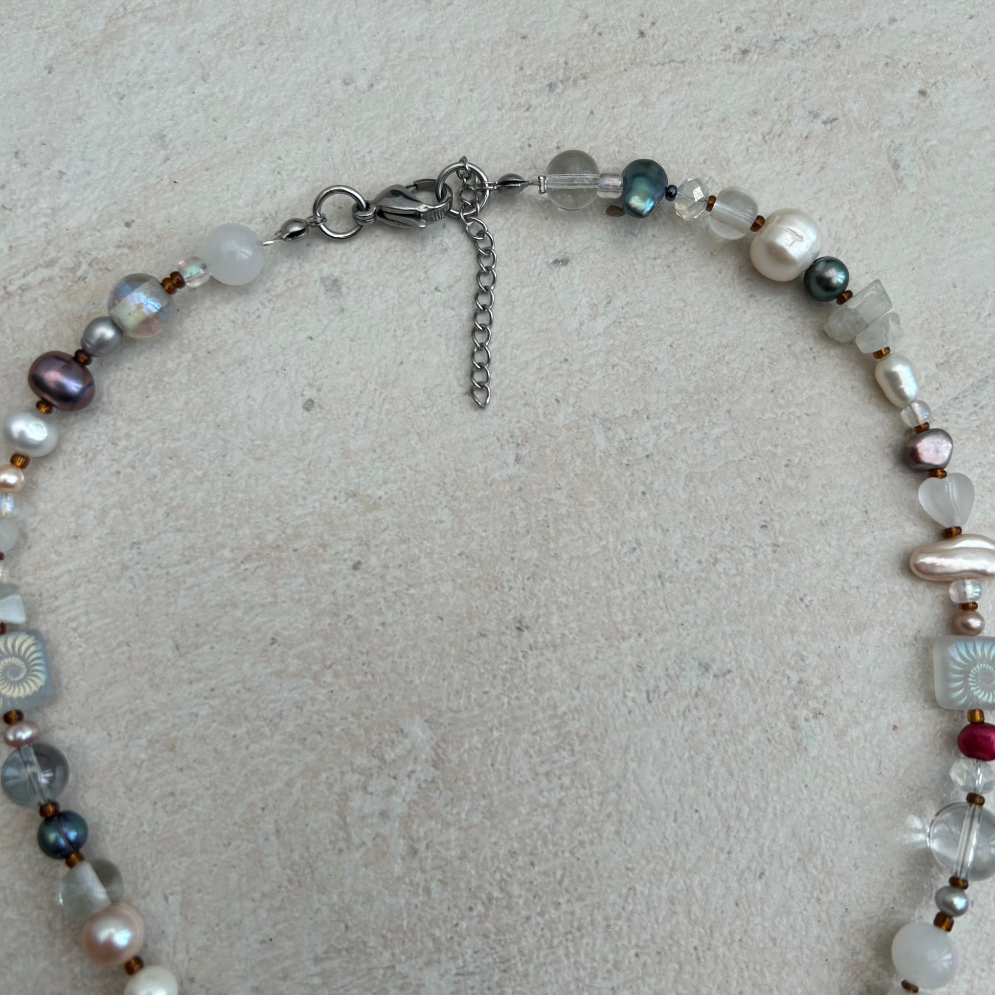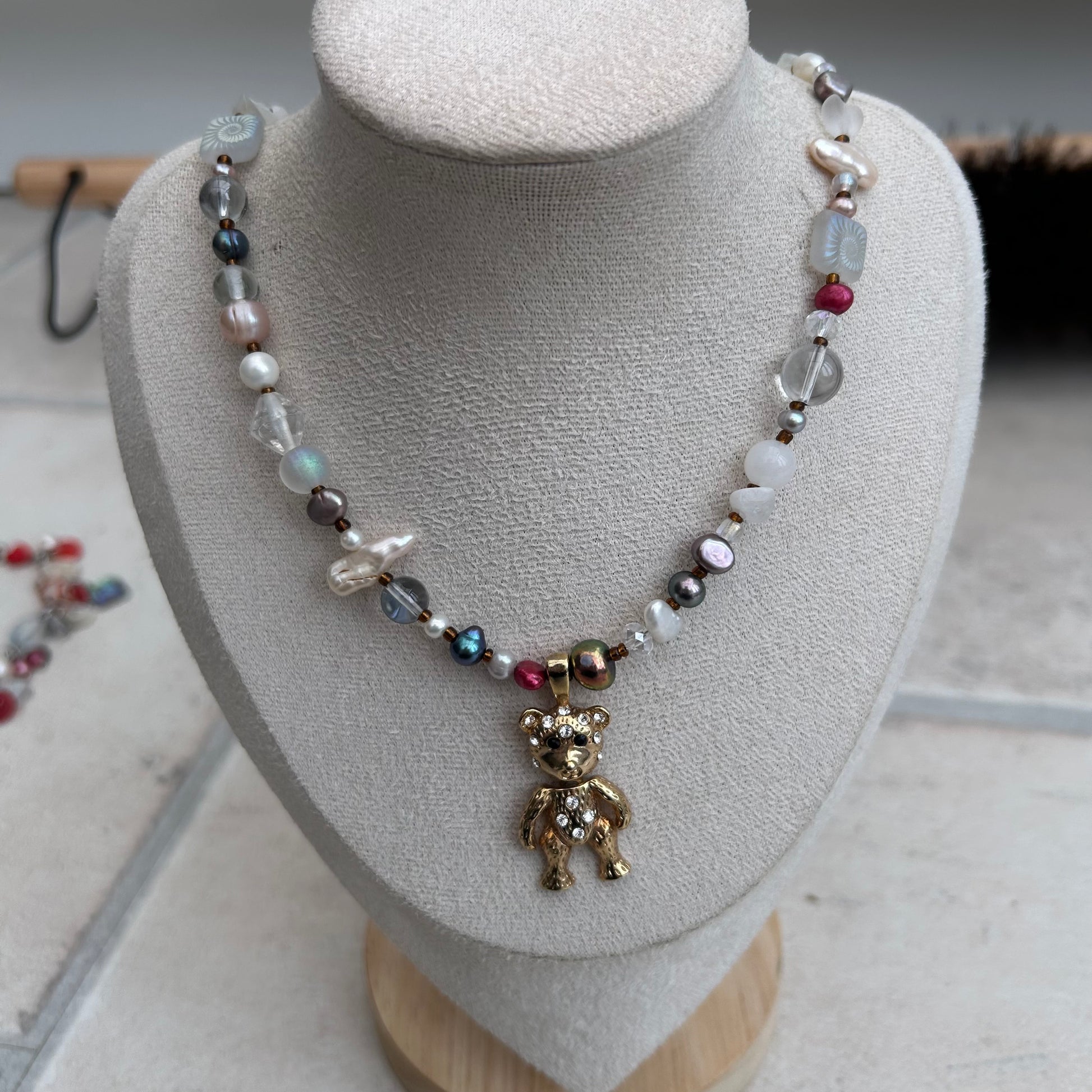 The Ros-ie necklace is made with freshwater pearls, glass seed beads, glass beads, laser etched glass beads, moonstone crystal chips and a vintage gold tone teddy bear rhinestone pendant.