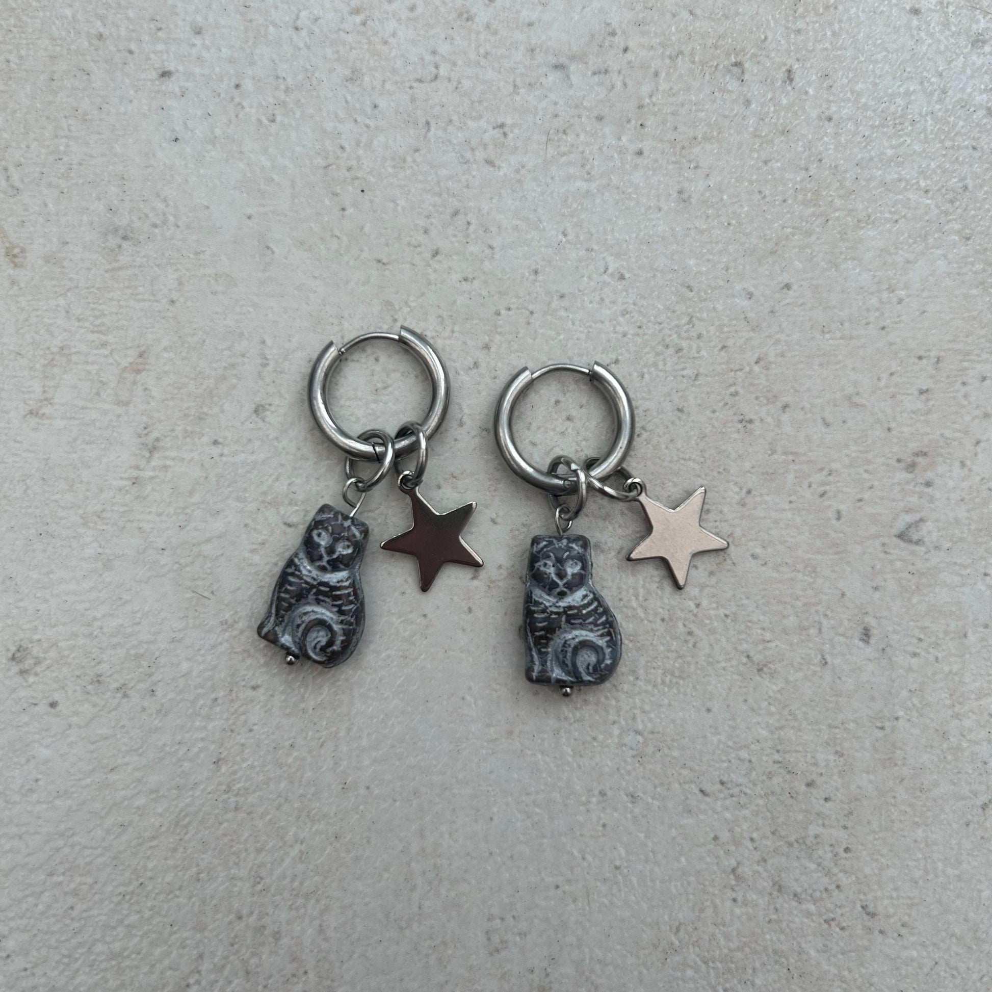 Czech brown/black glass cat beads on stainless steel hoop earrings with stainless steel star charm