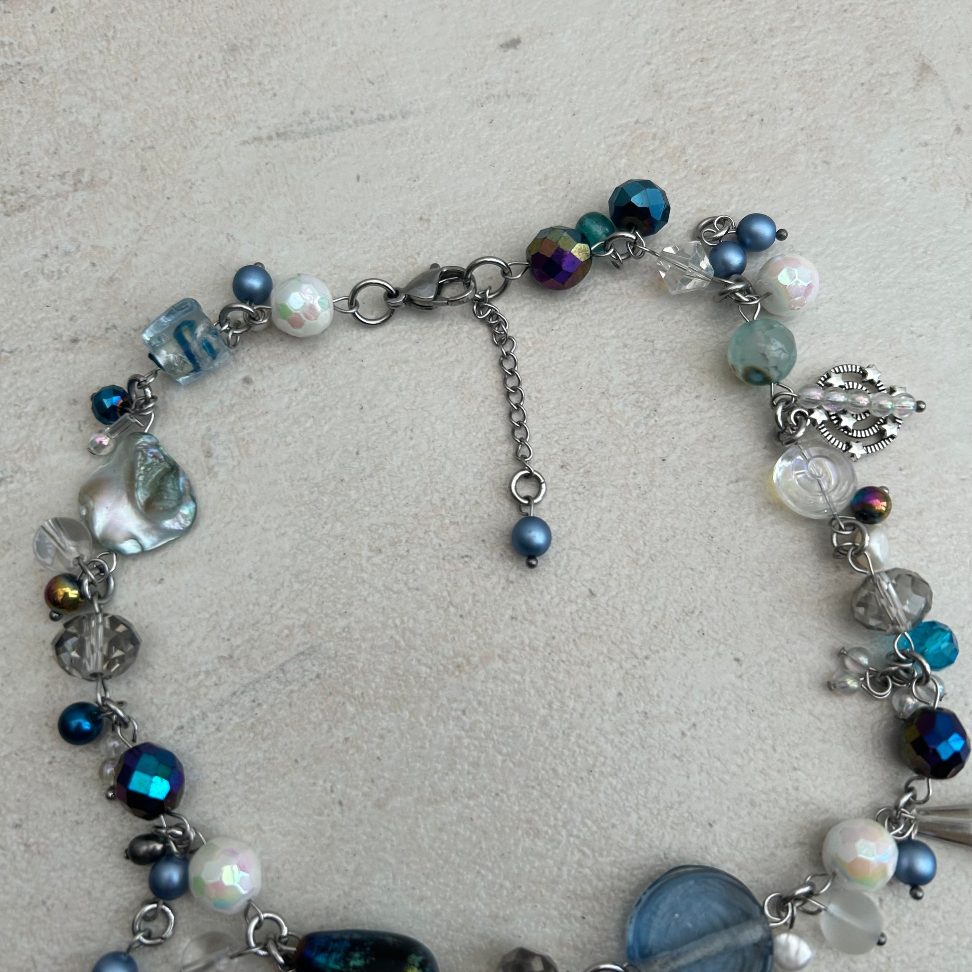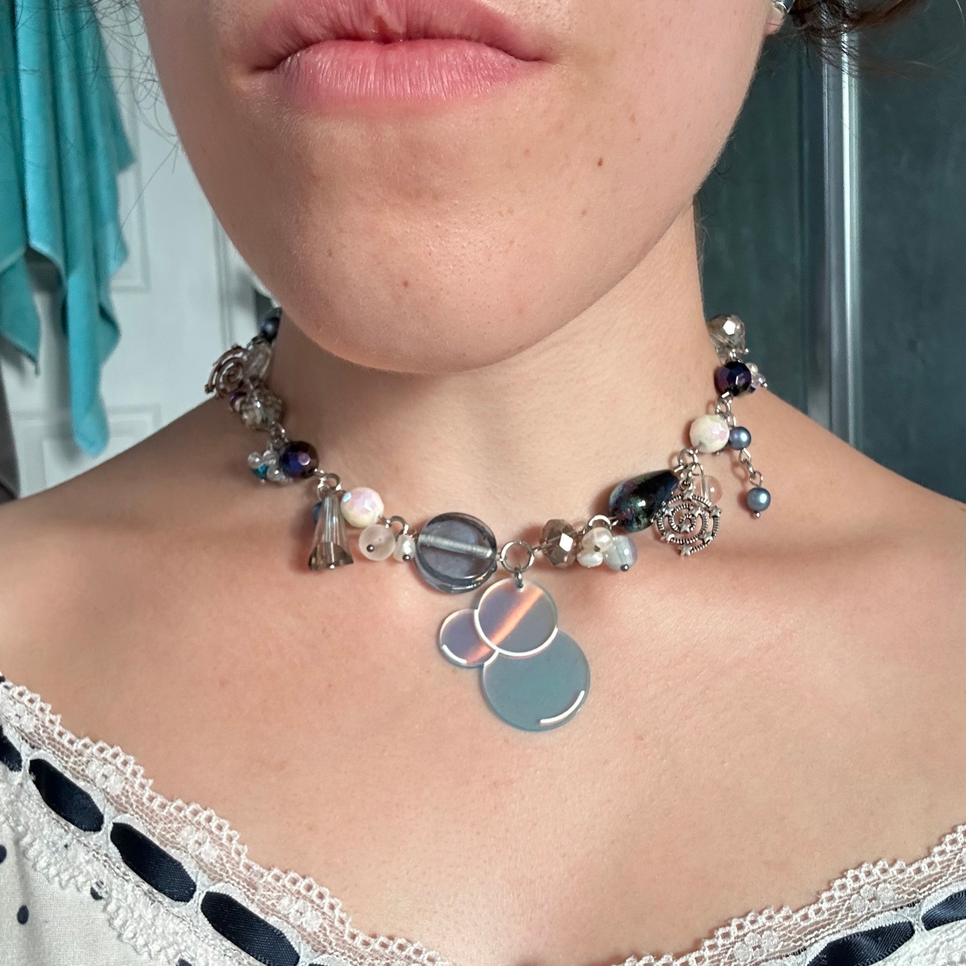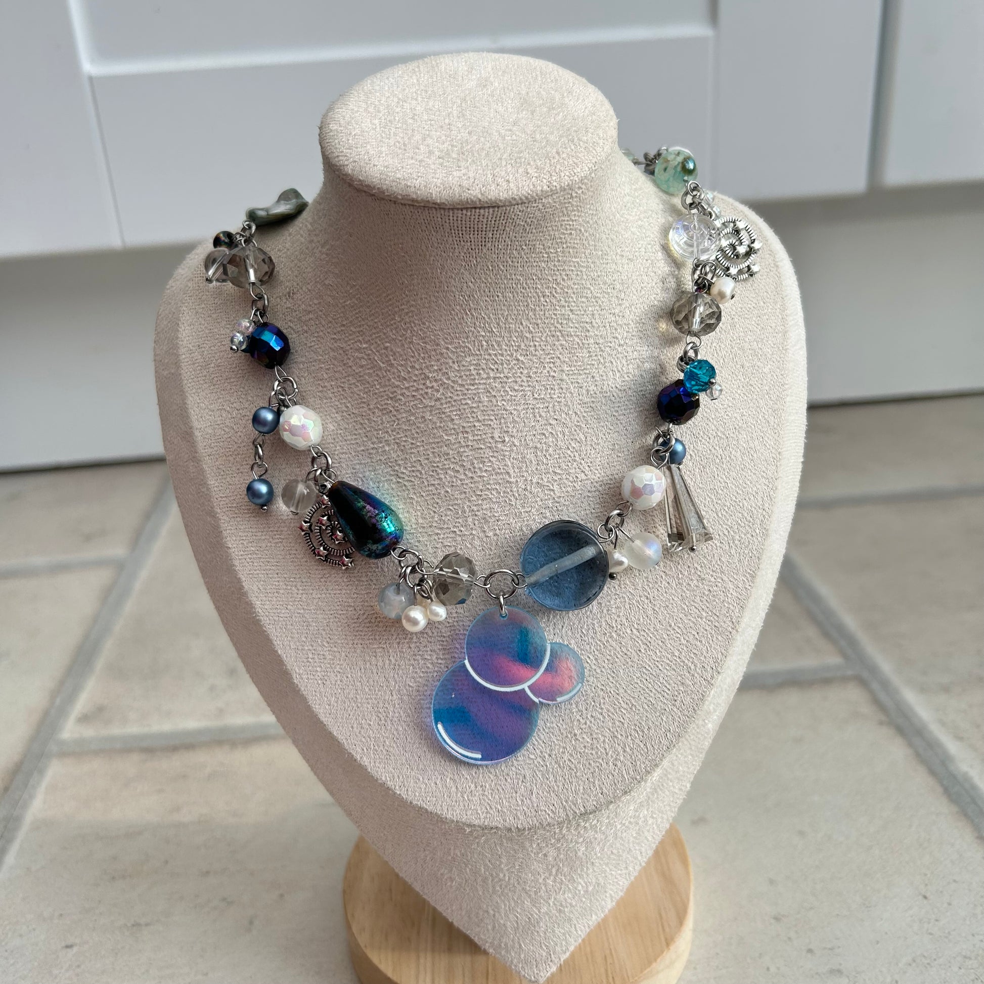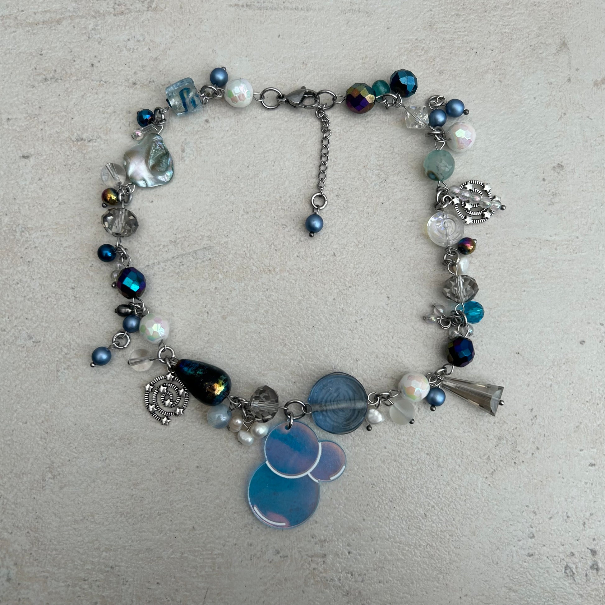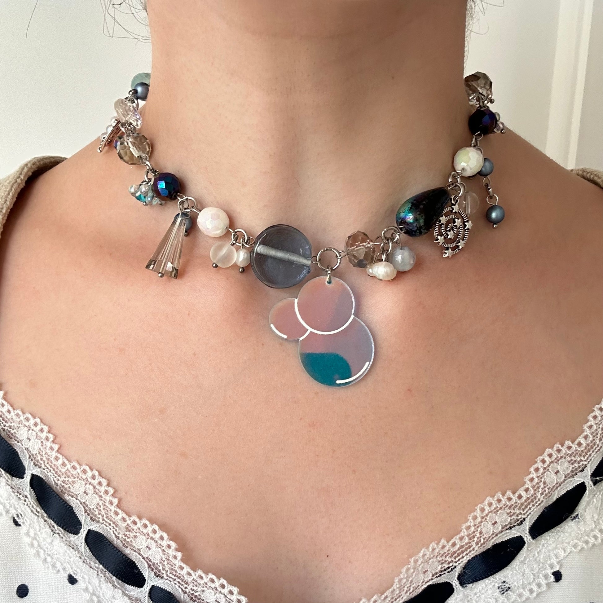 "Bubbles" glass, mother of pearl & freshwater pearl bubble charm pendant cluster clutter necklace