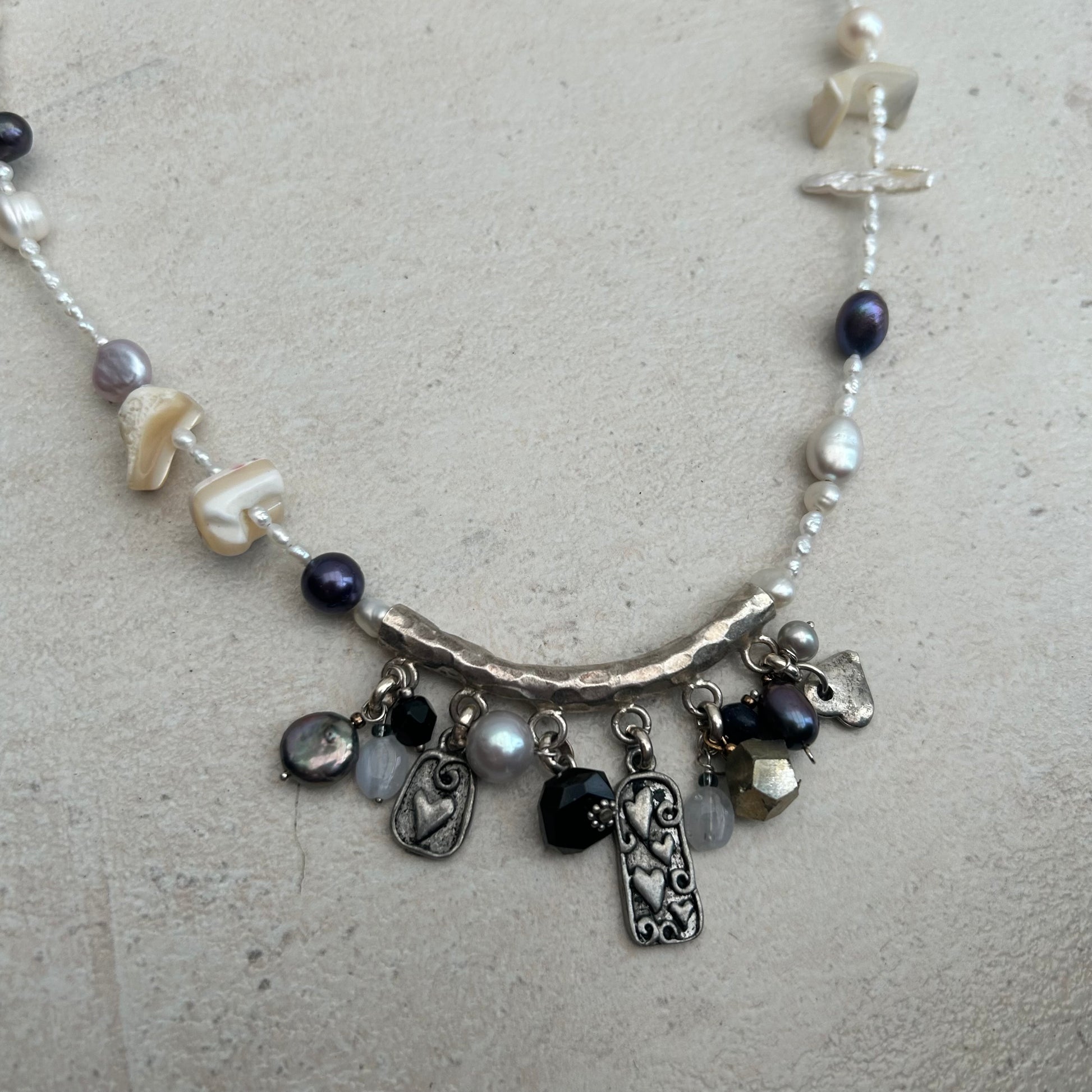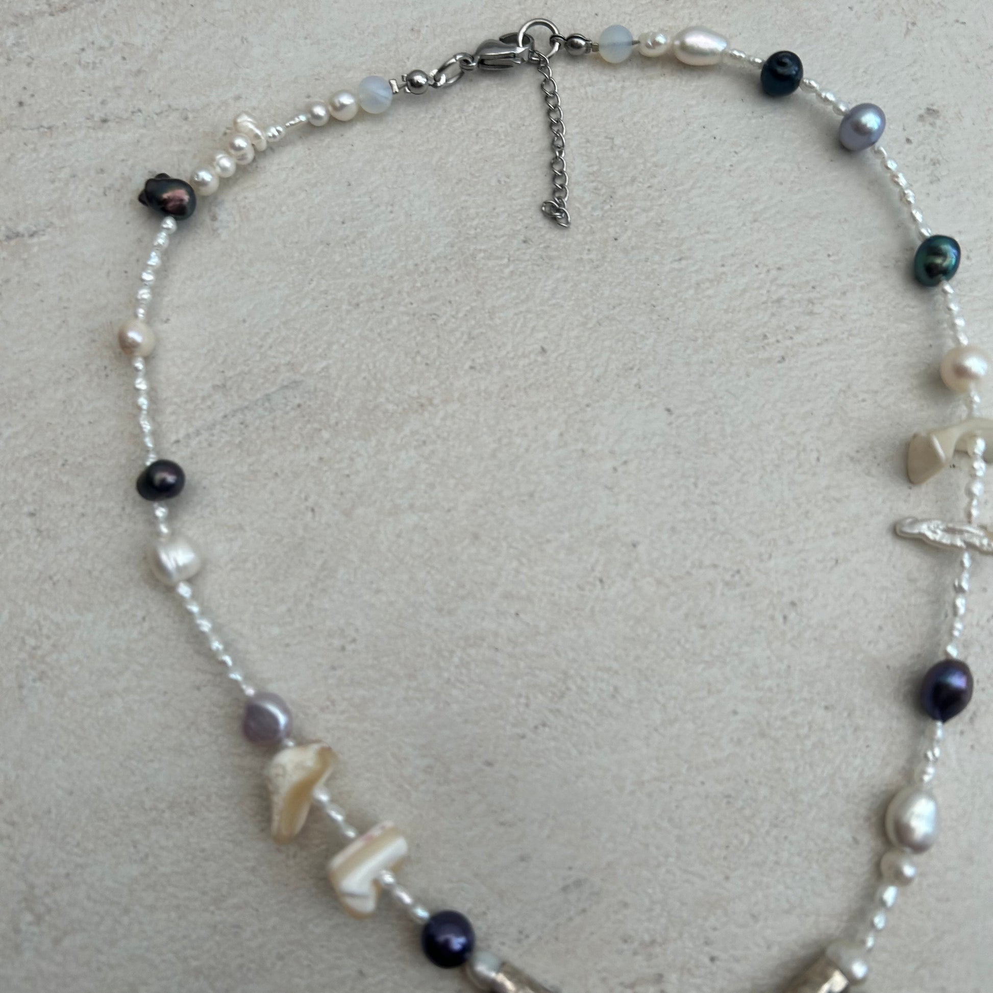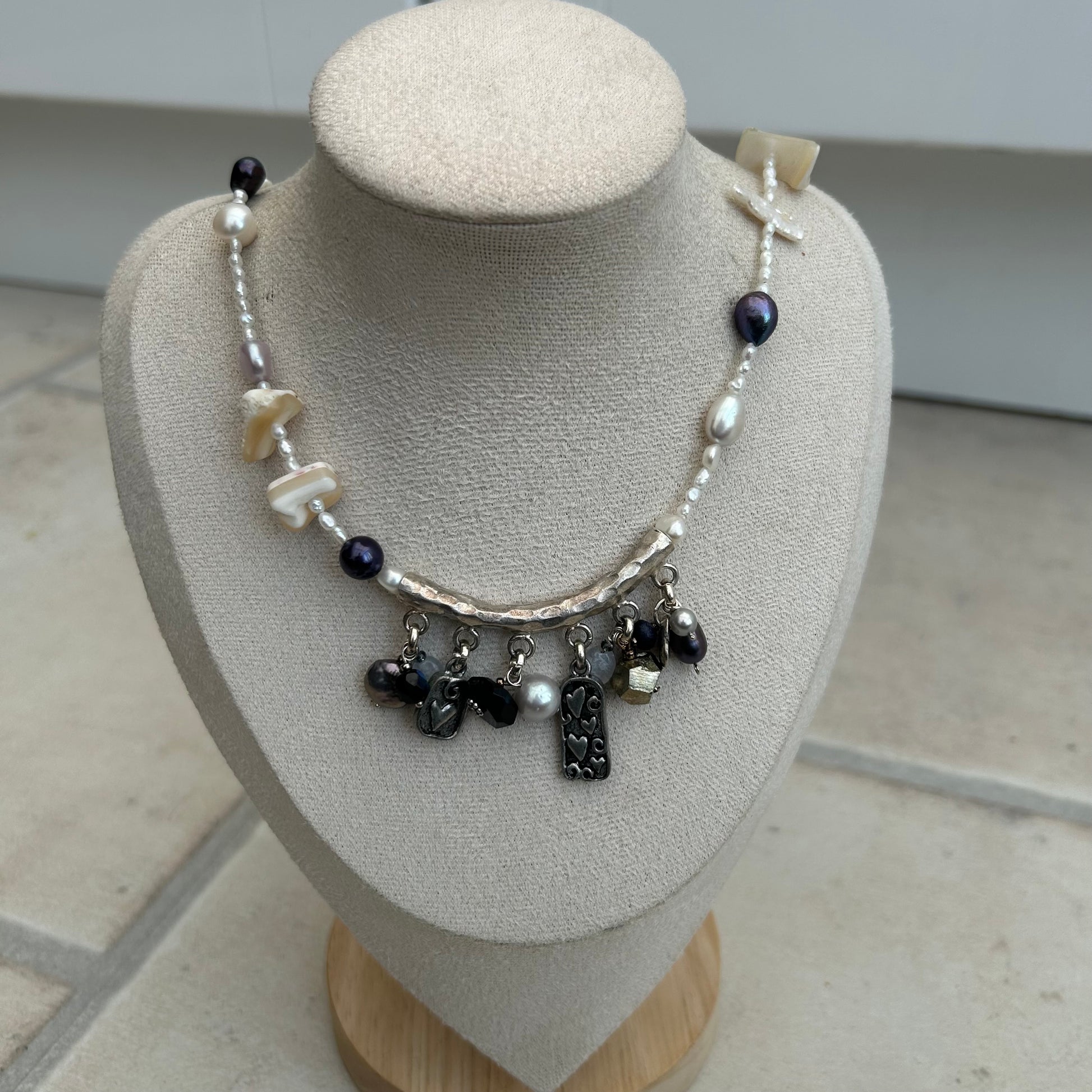 freshwater pearls and shell pieces with stainless steel findings and vintage pendant